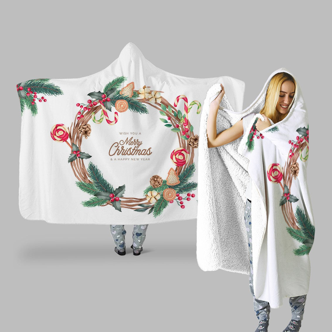 Merry Christmas Gift Floral Flowers Green Personalized Hooded Throw Blanket Fleece Hoodie Cape