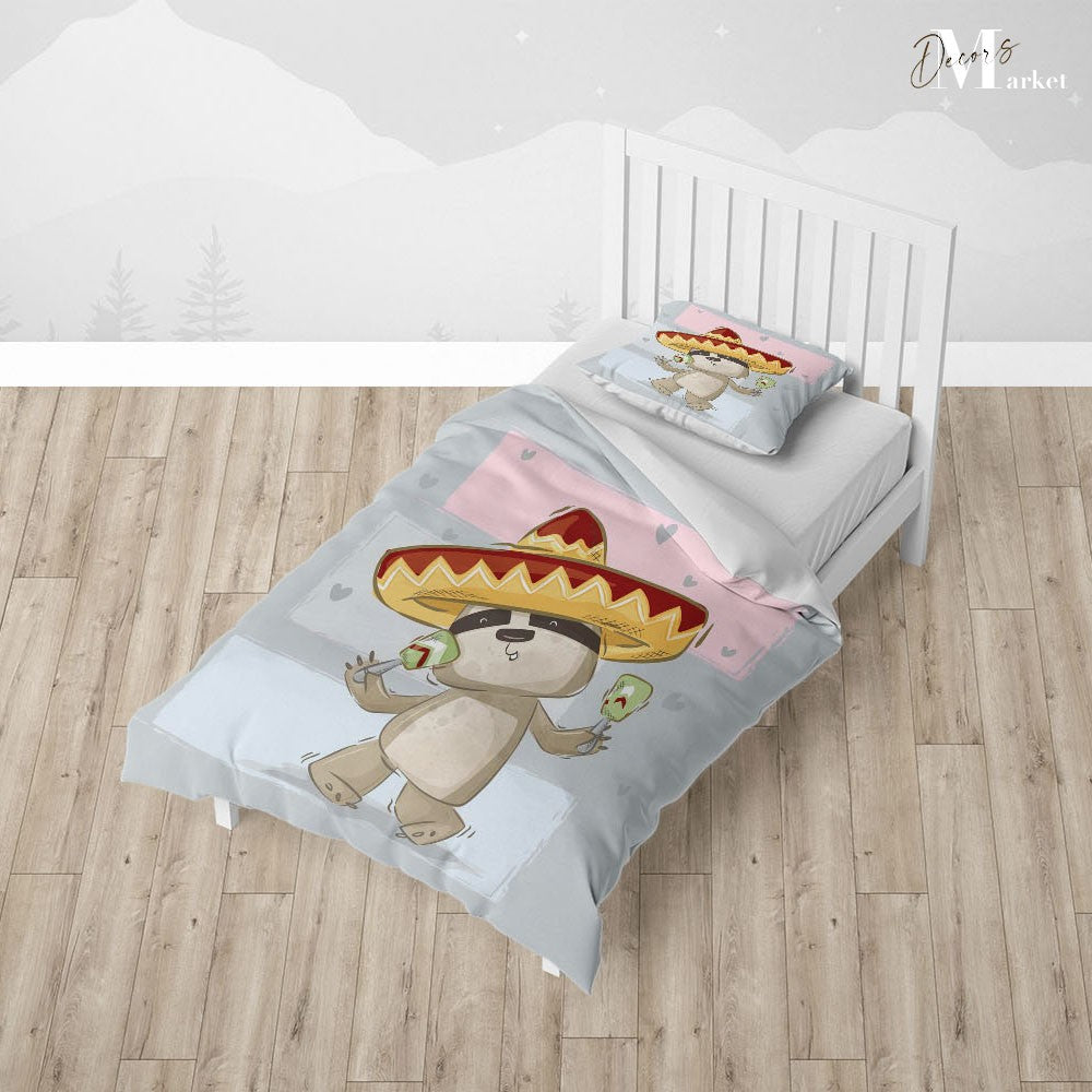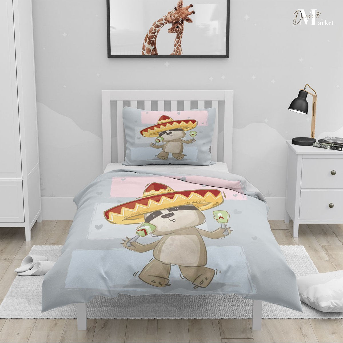 Mexican Panda Dance Duvet Cover Set w Pillow Cover, Gray Kids Cartoon 3D Quilt Cover, Single Double Queen King Size Doona Cover