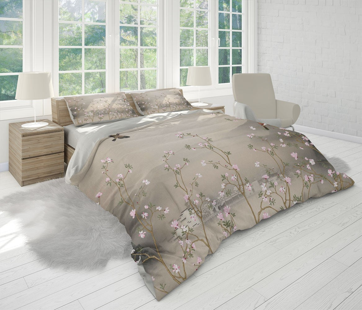 Misty Town Duvet Cover Set W Pillow Cover, Brown Art Chinoiserie 3D Quilt Cover, Single Double Queen King Size Doona Cover