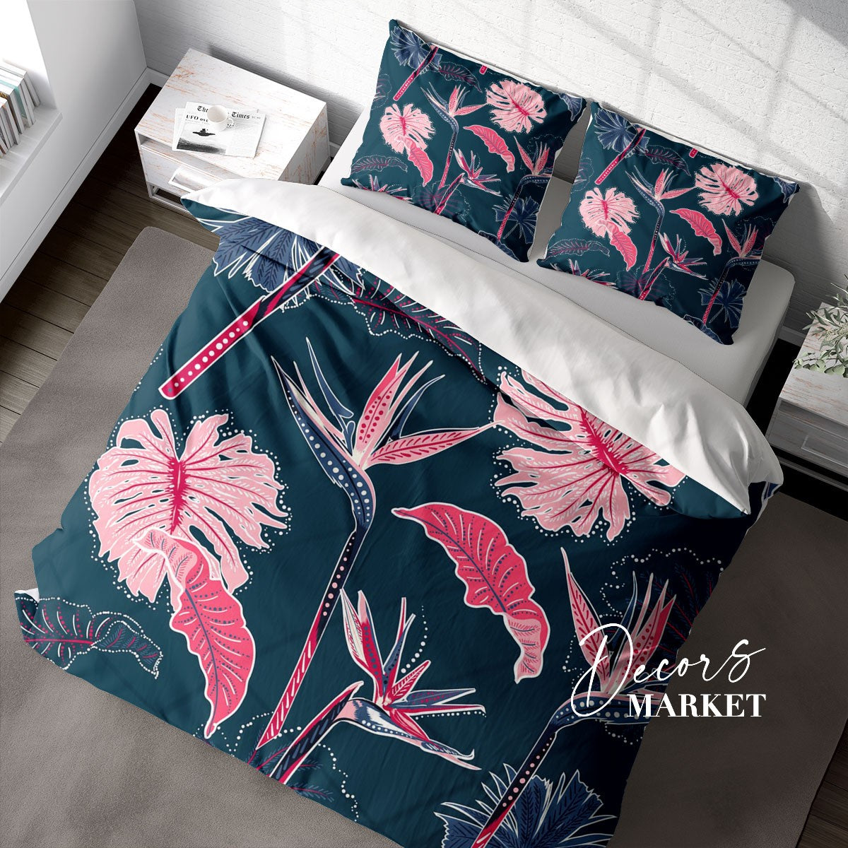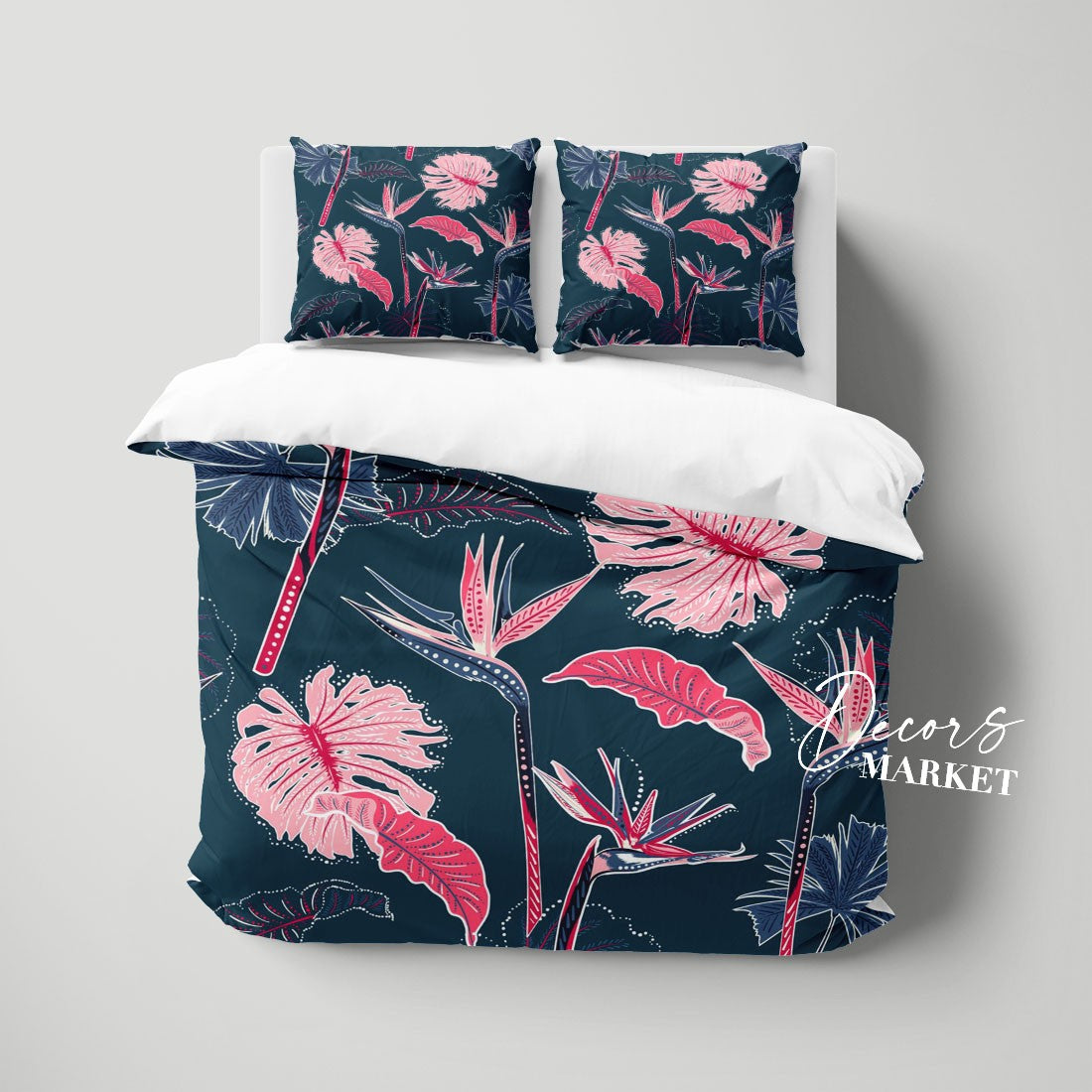 Monstera Bird of Paradise Duvet Cover Set w Pillowcases, Pink Floral Flowers 3D Quilt Cover, 3pc Single Double Queen King Size Doona Cover