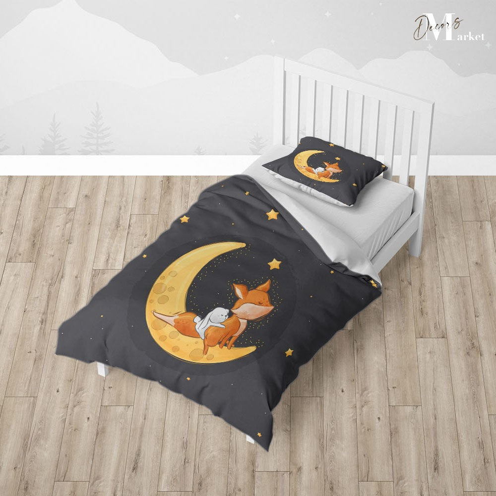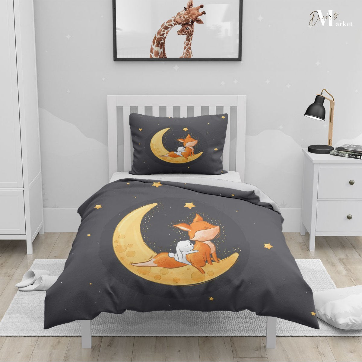 Moon Fox Rabbit Duvet Cover Set w Pillow Cover, Yellow Kids Cartoon 3D Quilt Cover, Single Double Queen King Size Doona Cover