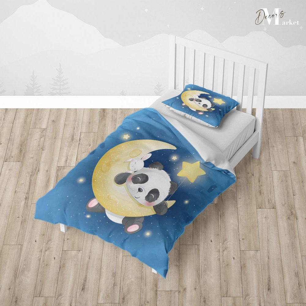 Moon Star Panda Duvet Cover Set w Pillow Cover, Blue Art Watercolor 3D Quilt Cover, Single Double Queen King Size Doona Cover