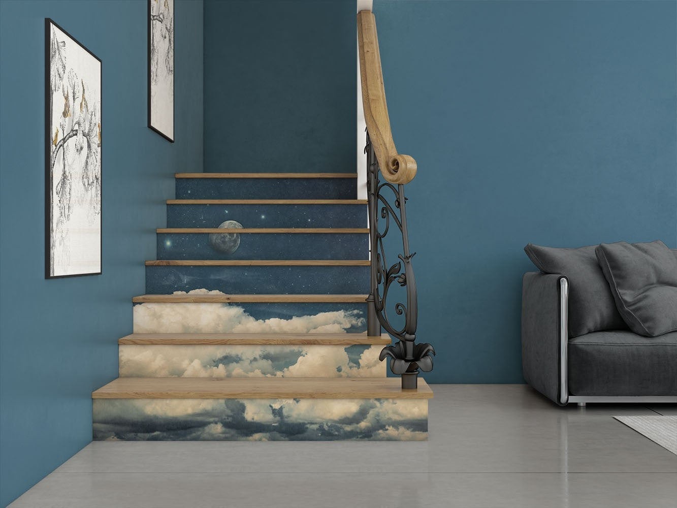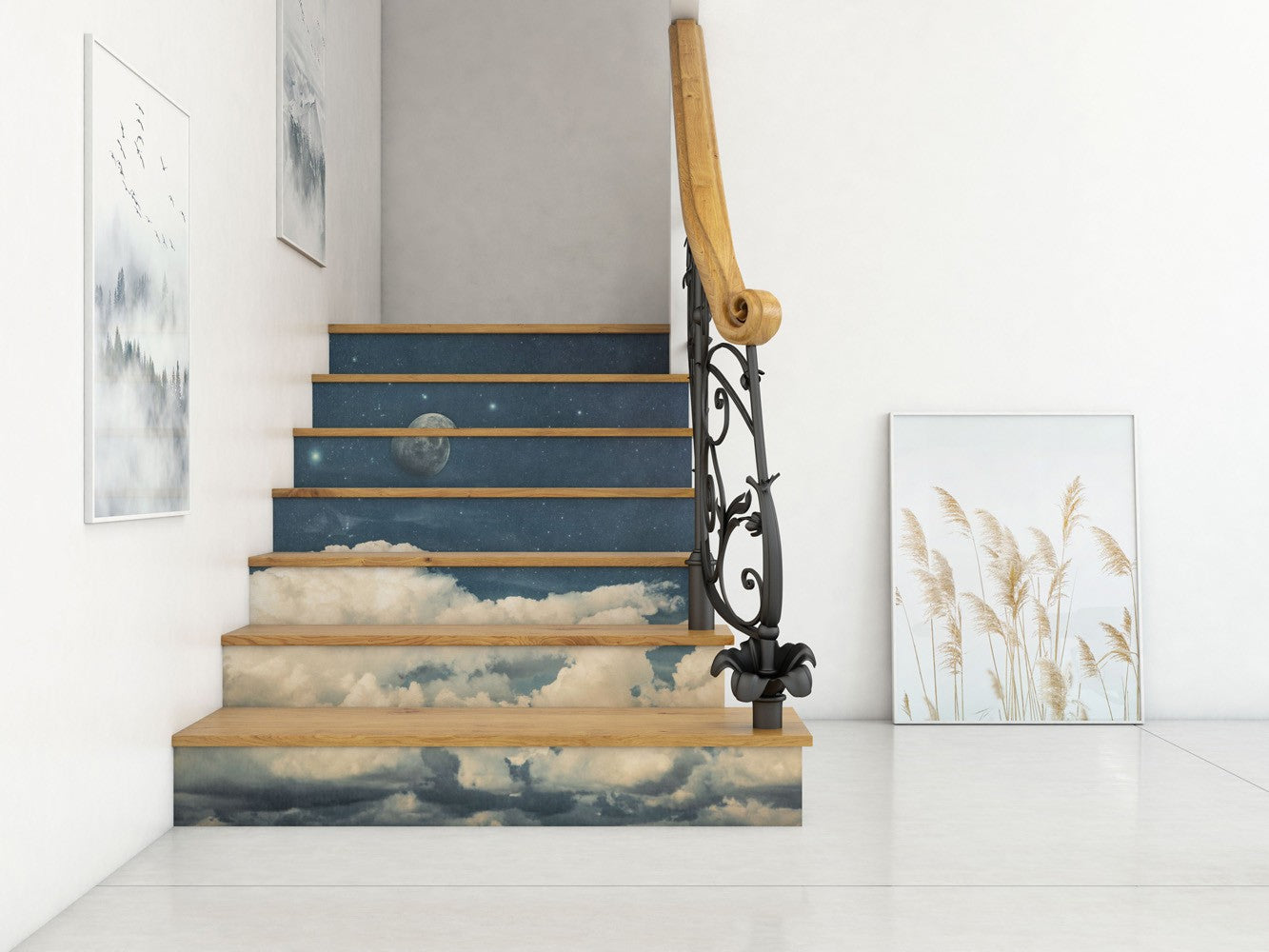 Moon Universe Nature Sky Blue Stair Riser Decals, Waterproof Removable Staircase Decals, Vinyl Peel And Stick Stairs Decal Stickers