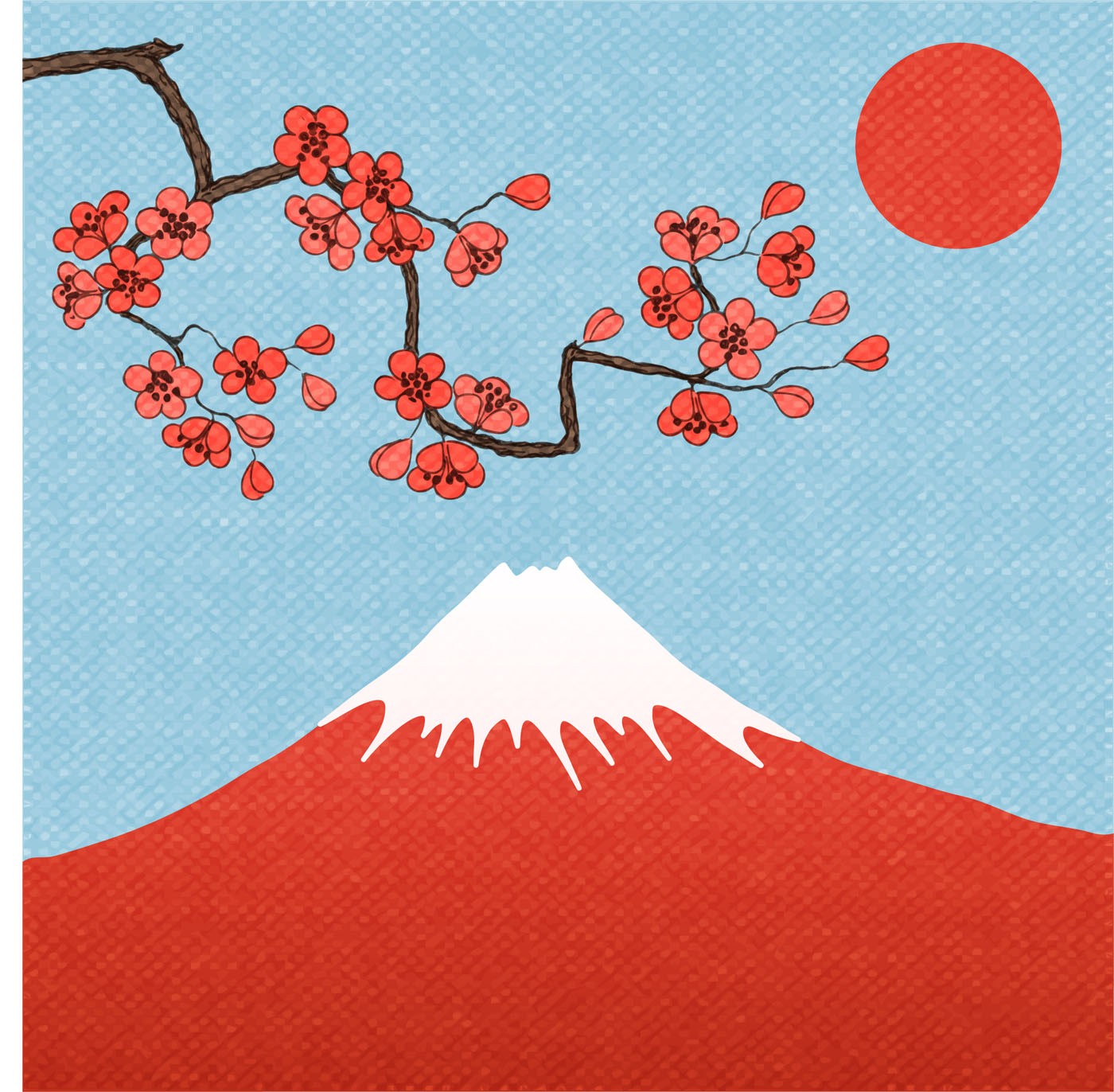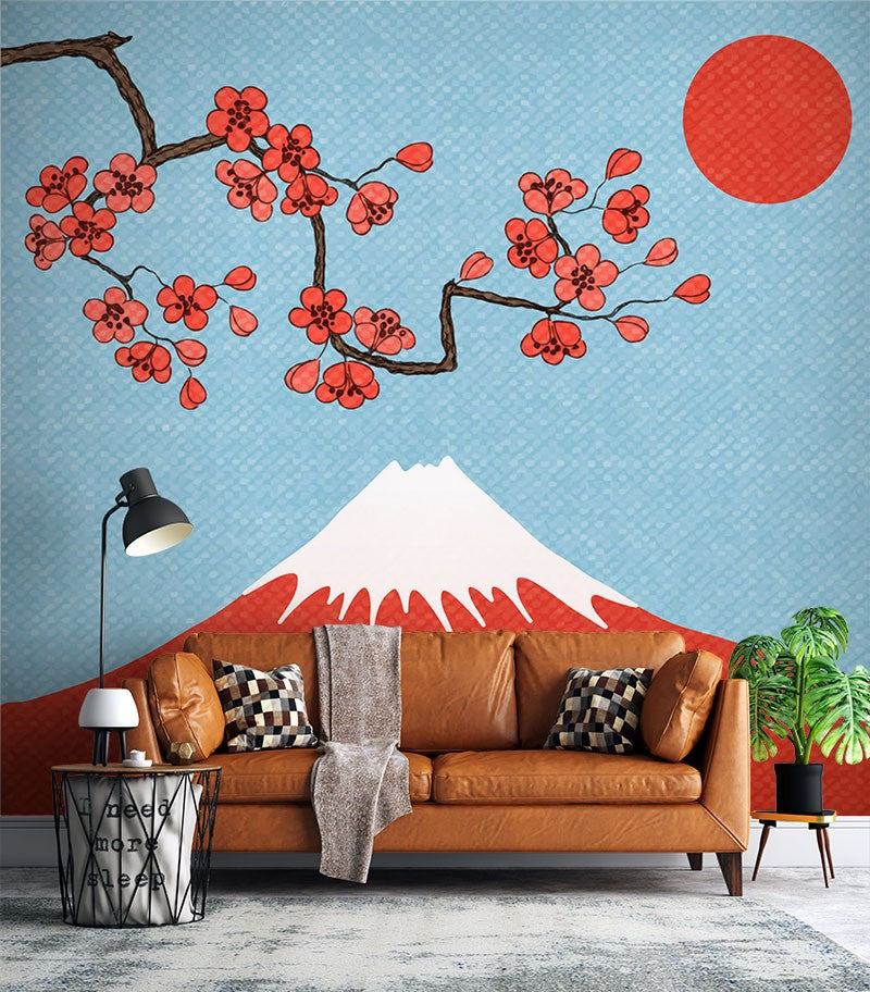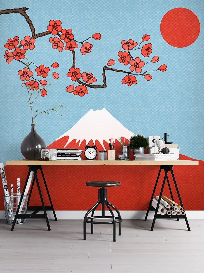 Mount Fuji Illustration Red Wallpaper Mural,Self-Adhesive Peel And Stick 3D Wall Decal,Australian Company Designer Wall Decor
