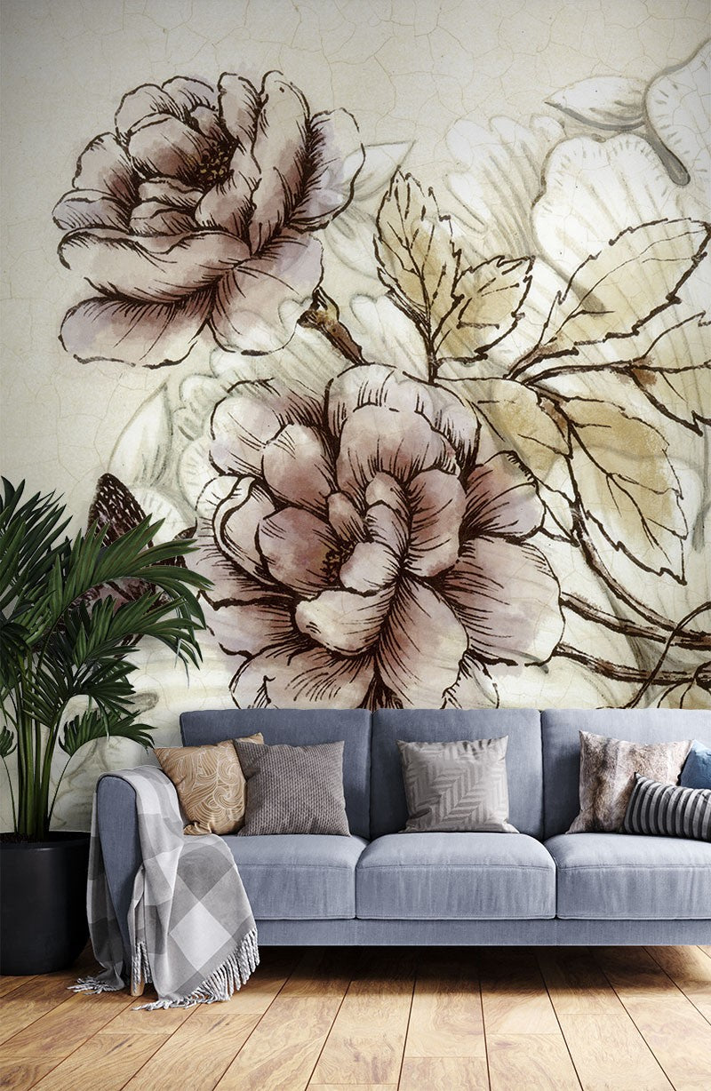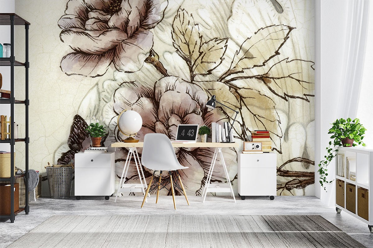 Moutan Dutch Flower Art Traditional Brown Wallpaper Mural,Self-Adhesive Peel And Stick 3D Wall Paper,Removable Designer Wall Decor