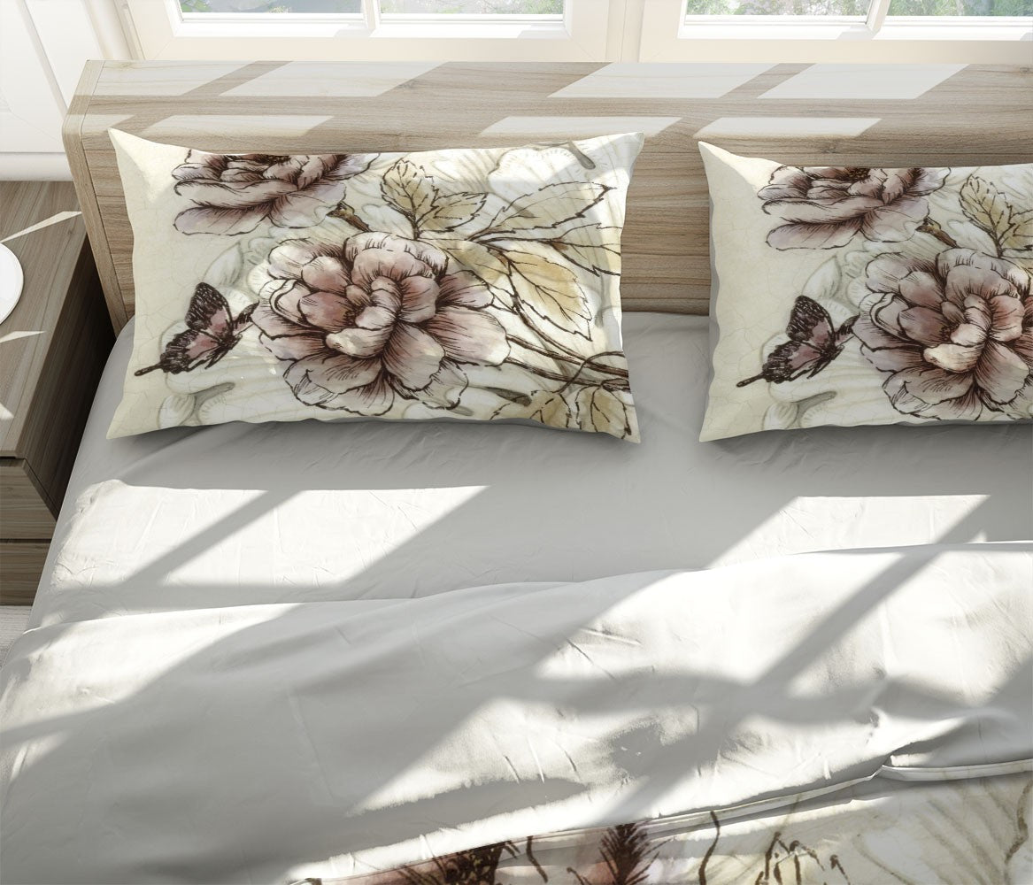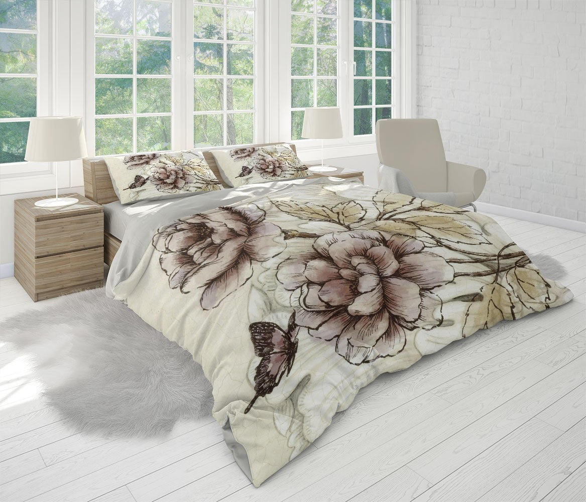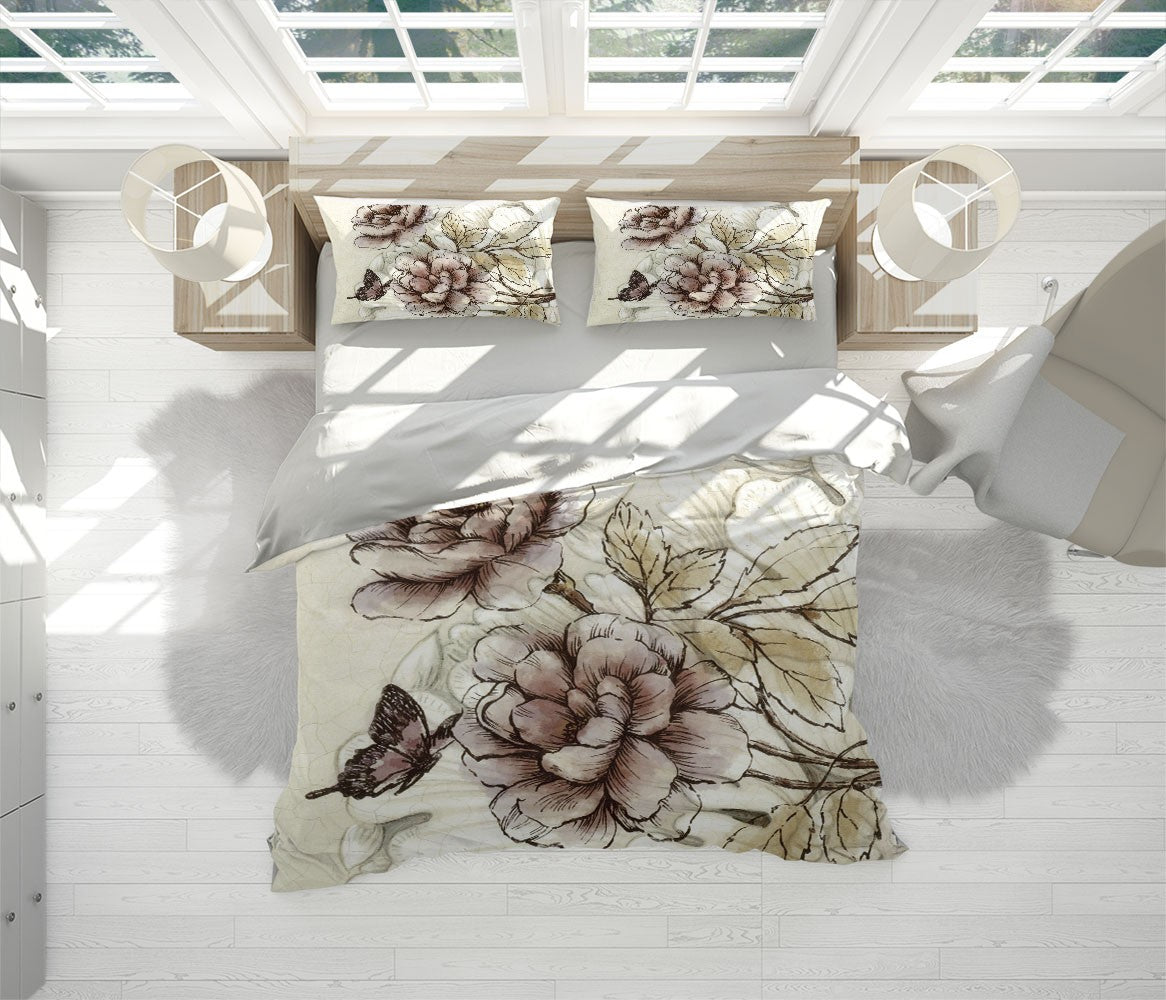 Moutan Flower Art Traditional Brown 3D Duvet Cover Set W Pillow Cover, Single Double Queen King Size, Printed Cotton Quilt Doona Cover 3 Pcs