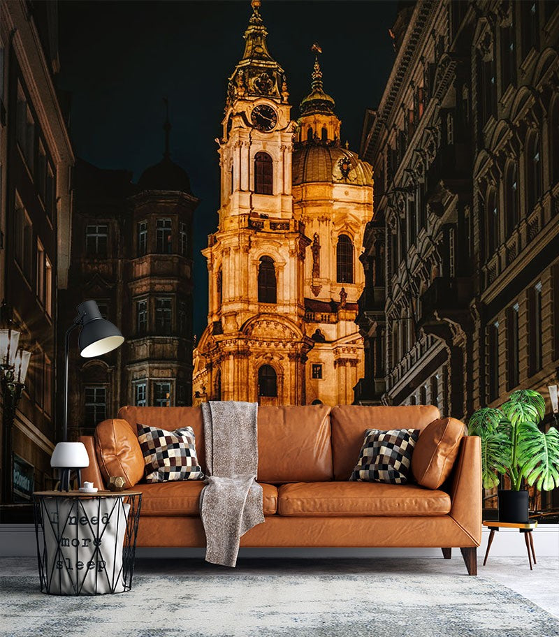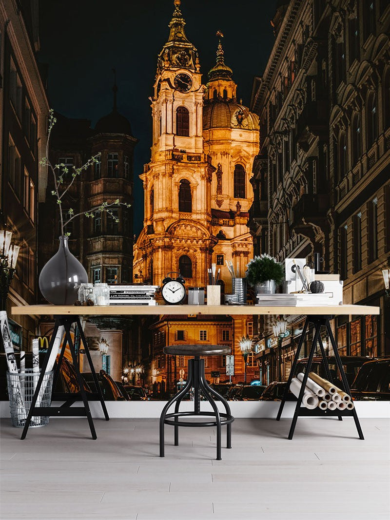 Night View City Architecture Yellow Wallpaper Mural,Self-Adhesive Peel And Stick 3D Wall Mural,Removable Bedroom Wall Decor