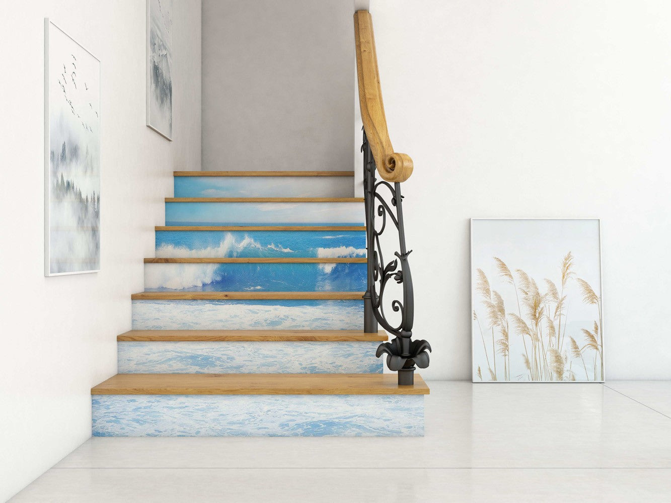 Ocean Wave Beach Blue Stair Riser Decals, Waterproof Removable Staircase Decals, Vinyl Peel And Stick Stairs Decal Stickers