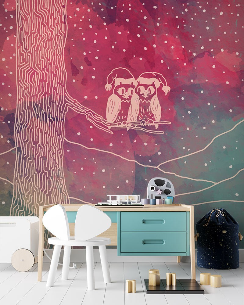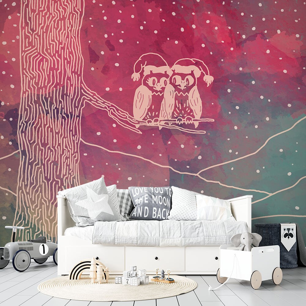 Owl Christmas Kids Colorful Red Wallpaper Mural,Self-Adhesive Peel And Stick 3D Wall Decor,Designer Australian Company Wall Decor
