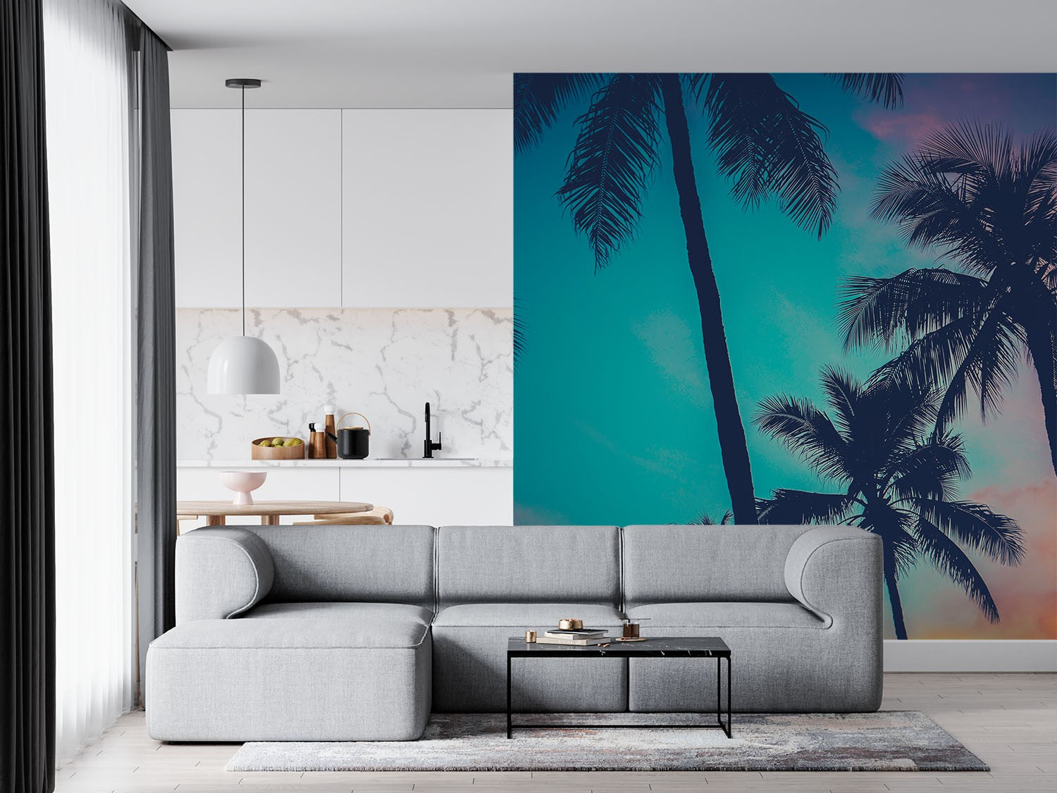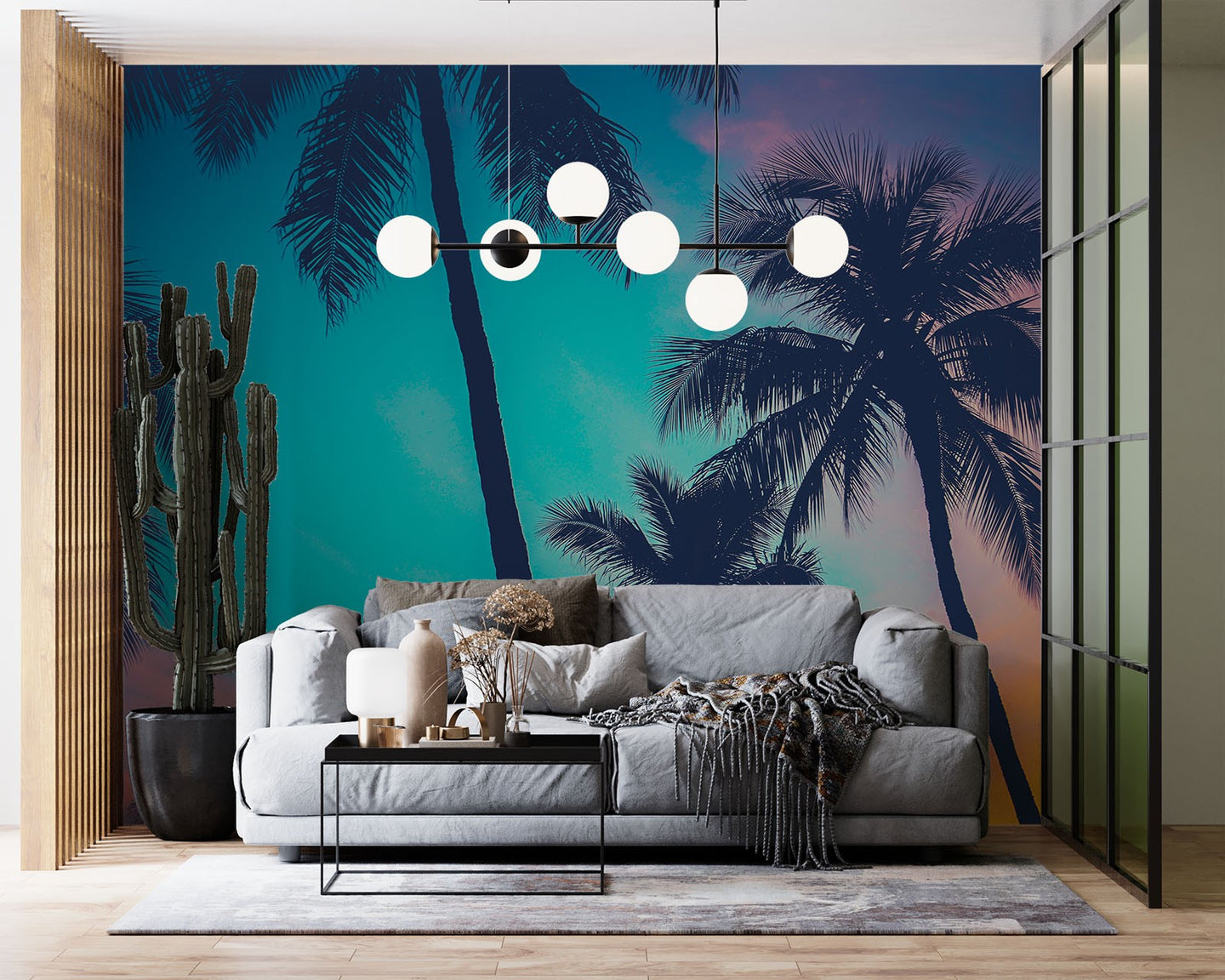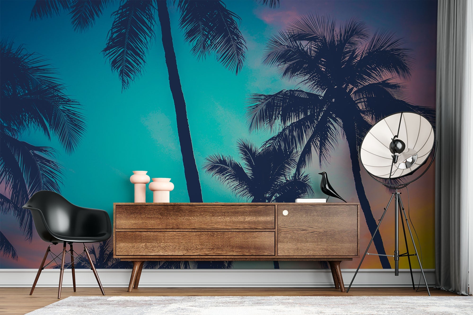 Palm Sunset Beach Sunrise & Sunset Blue Wallpaper Mural