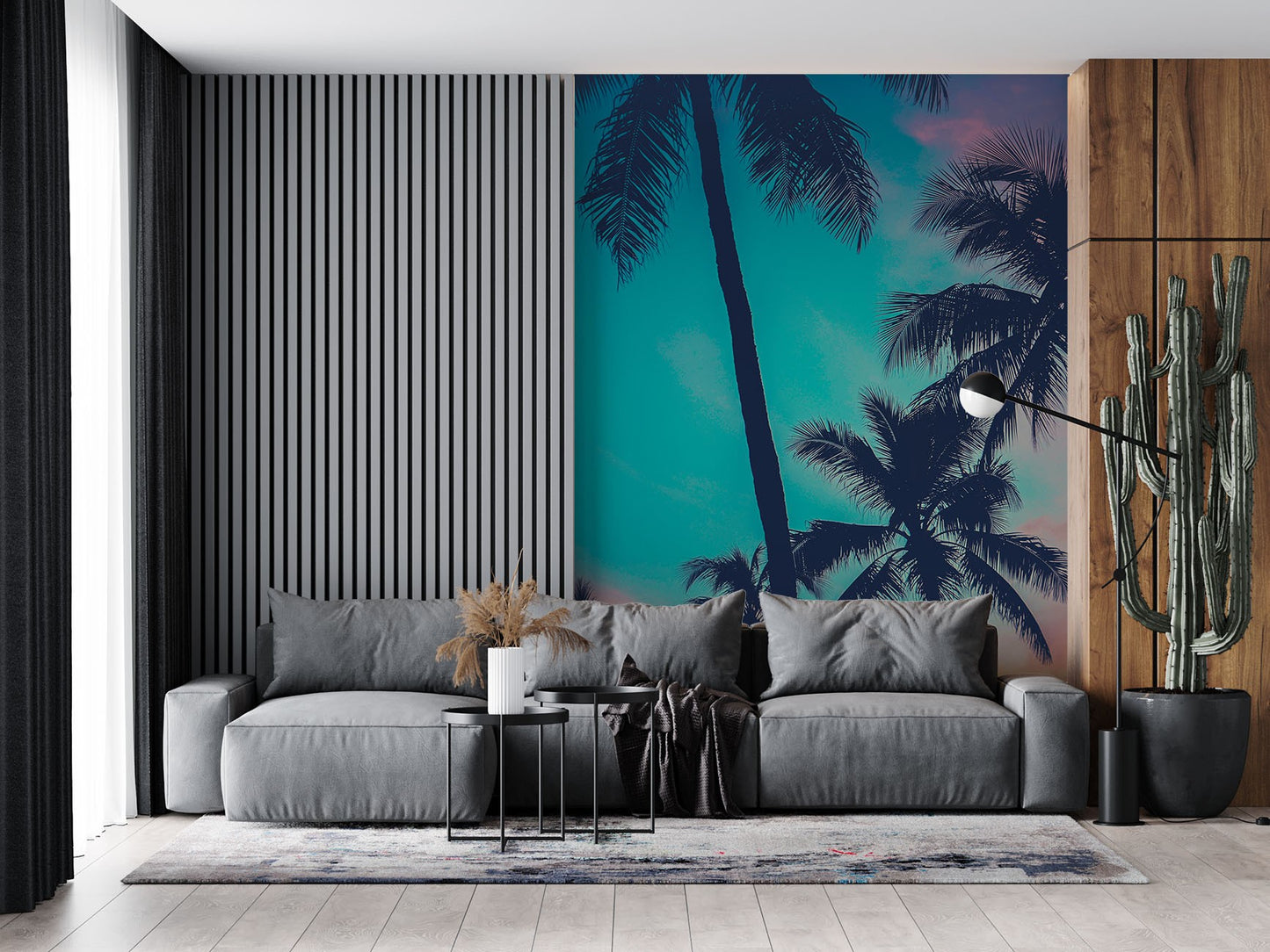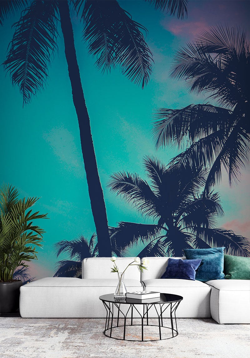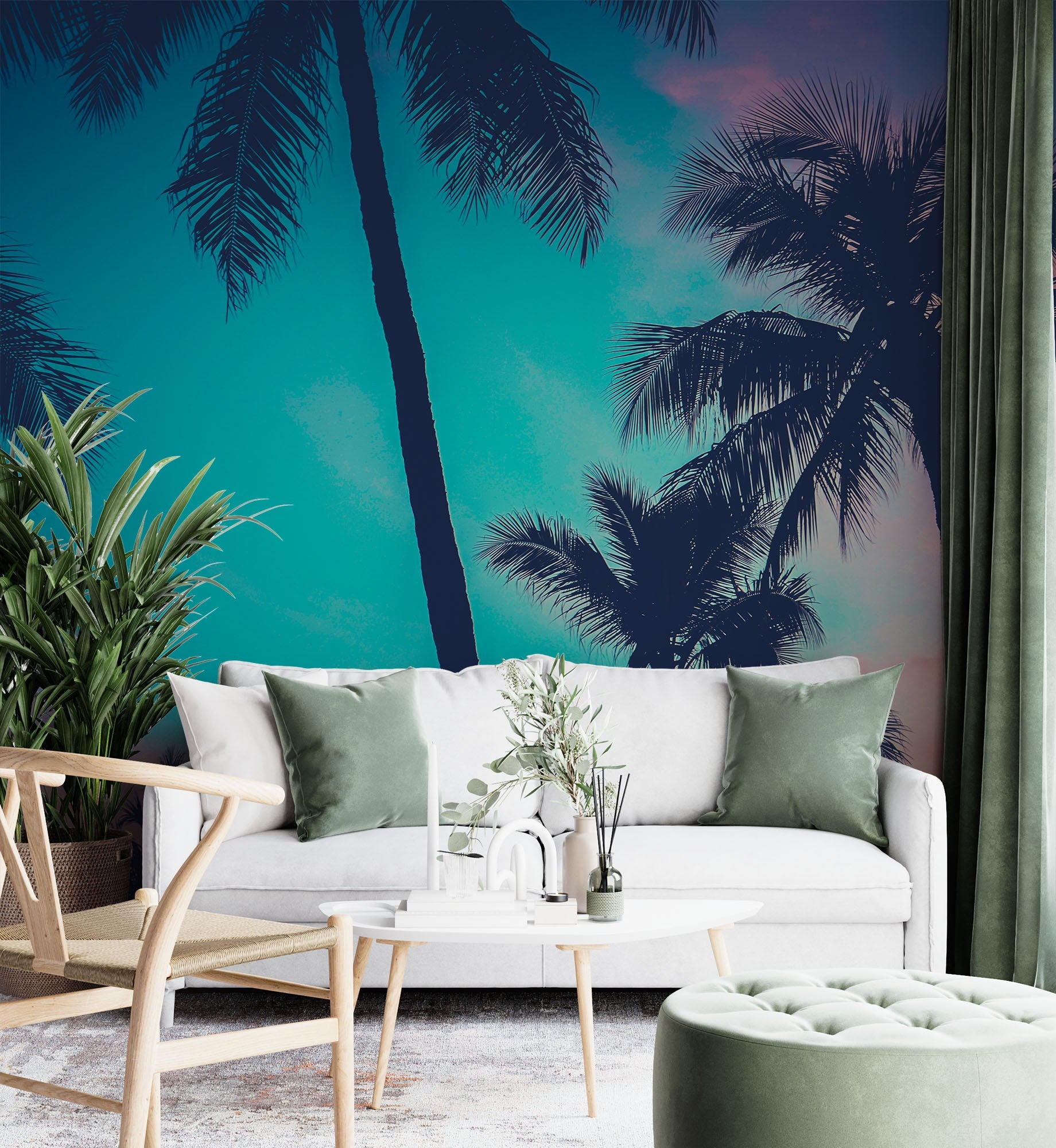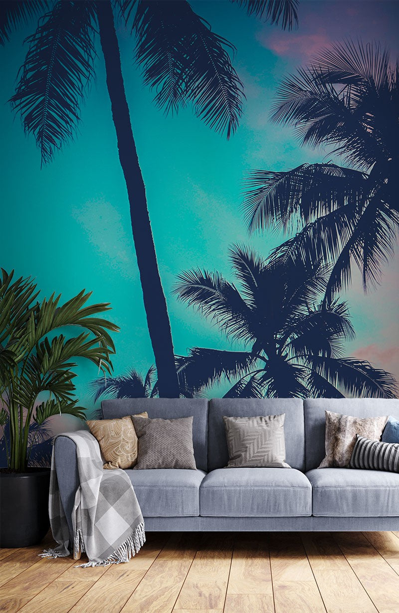 Palm Sunset Beach Sunrise & Sunset Blue Wallpaper Mural