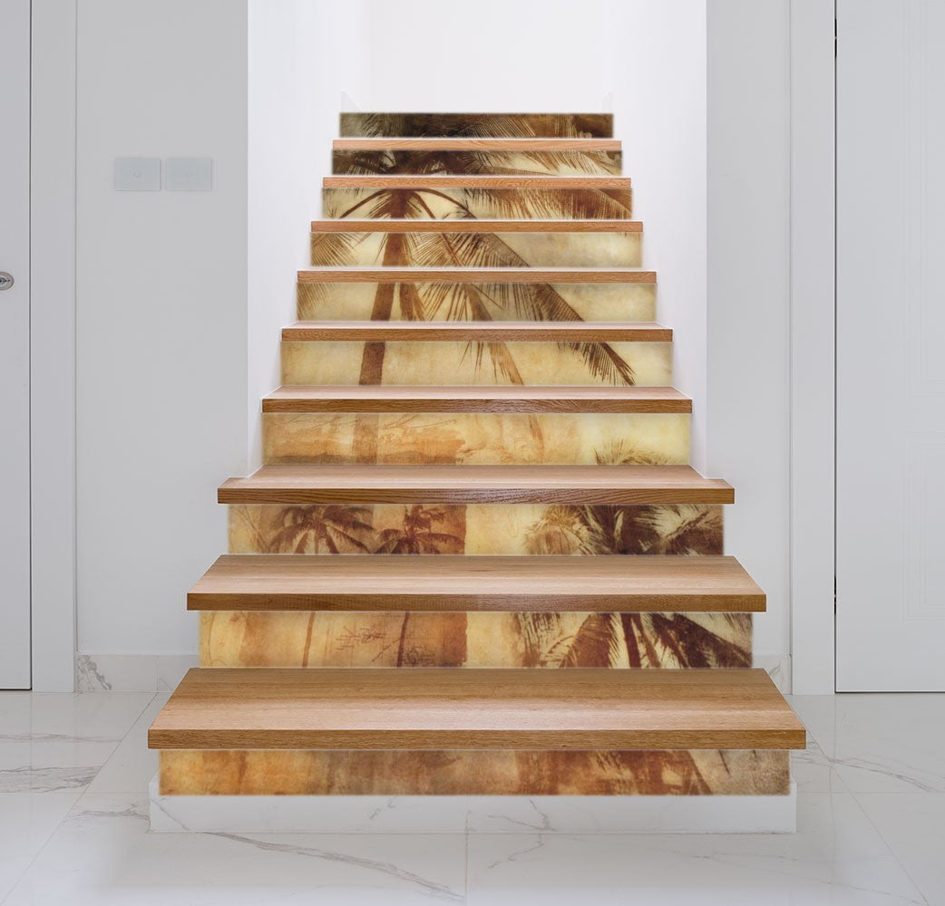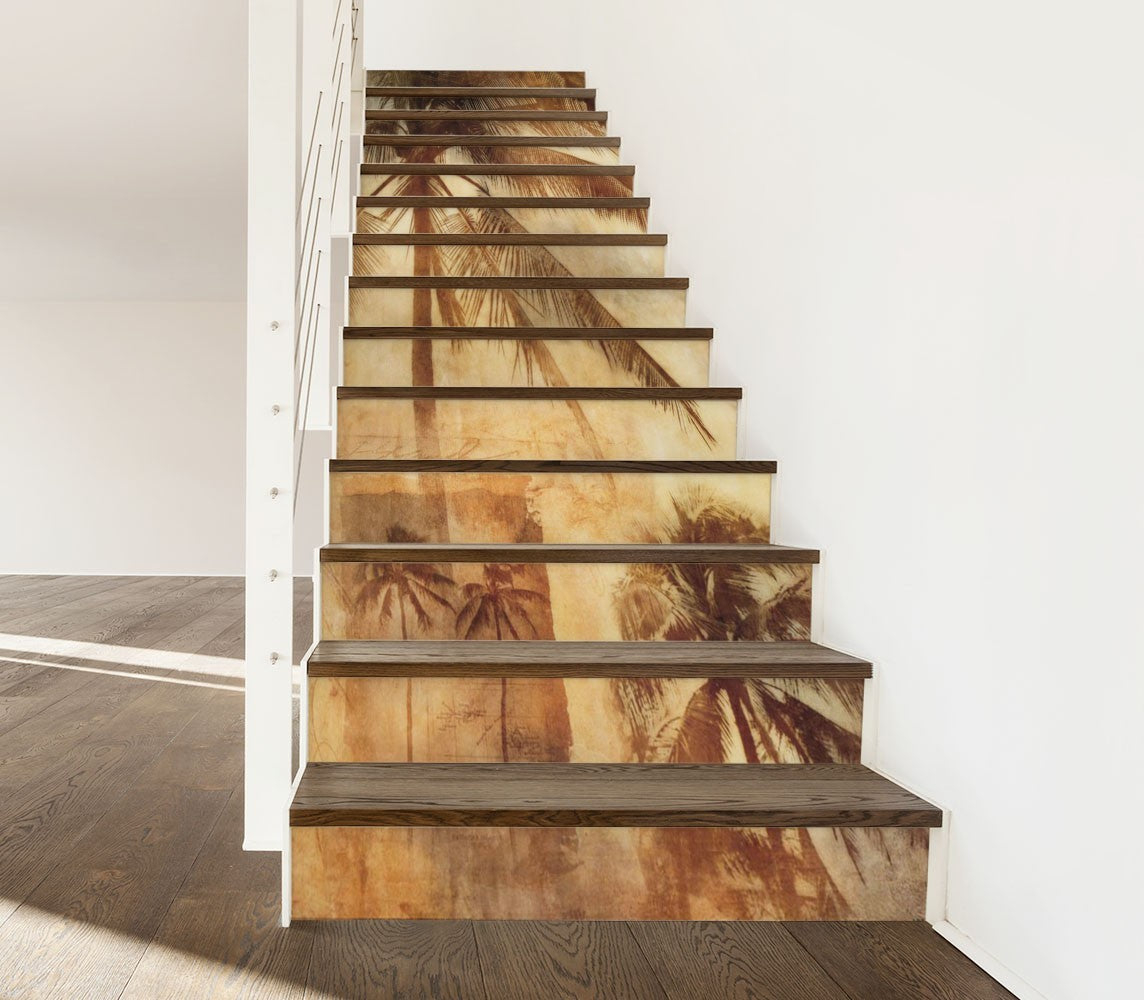 Palm Trees Art Contemporary Brown Stair Riser Decals, Waterproof Removable Staircase Decals, Vinyl Peel And Stick Stairs Decal Stickers