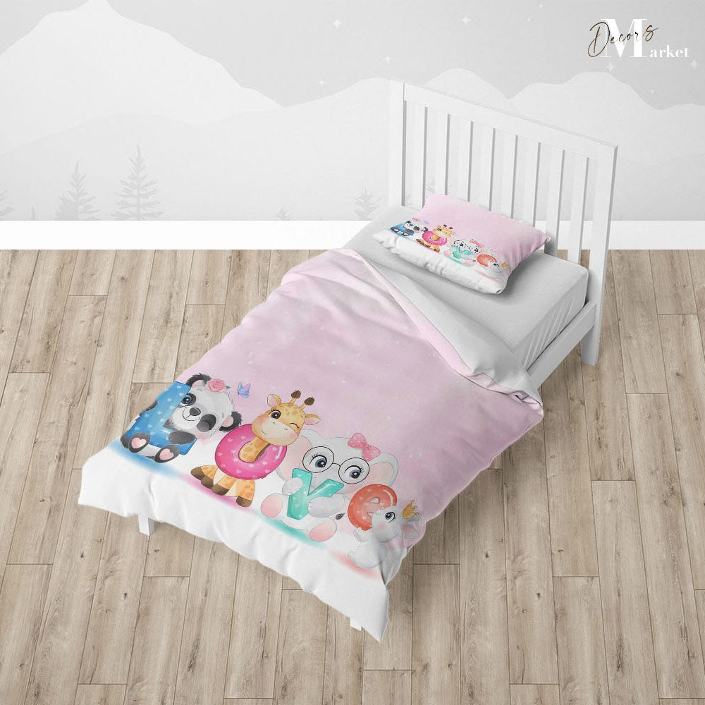 Panda Elephant Friends Duvet Cover Set w Pillow Cover, Pink Kids Cartoon 3D Quilt Cover, Single Double Queen King Size Doona Cover