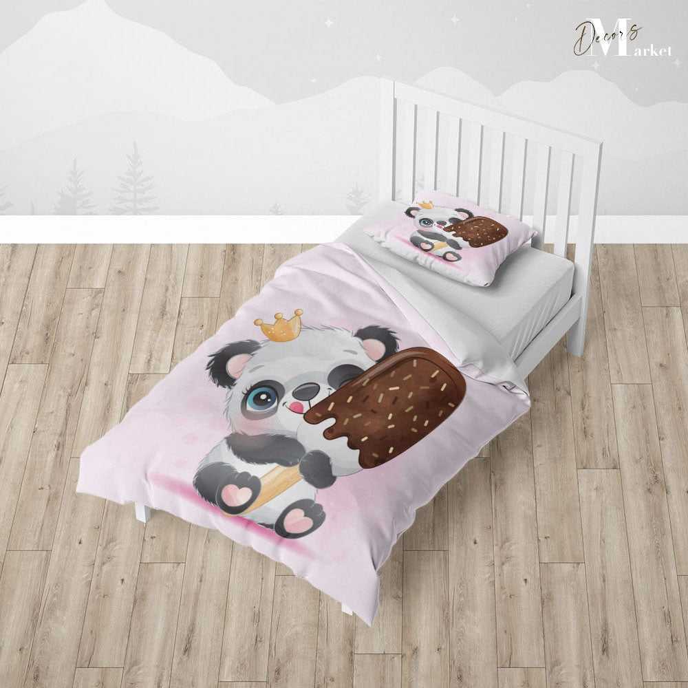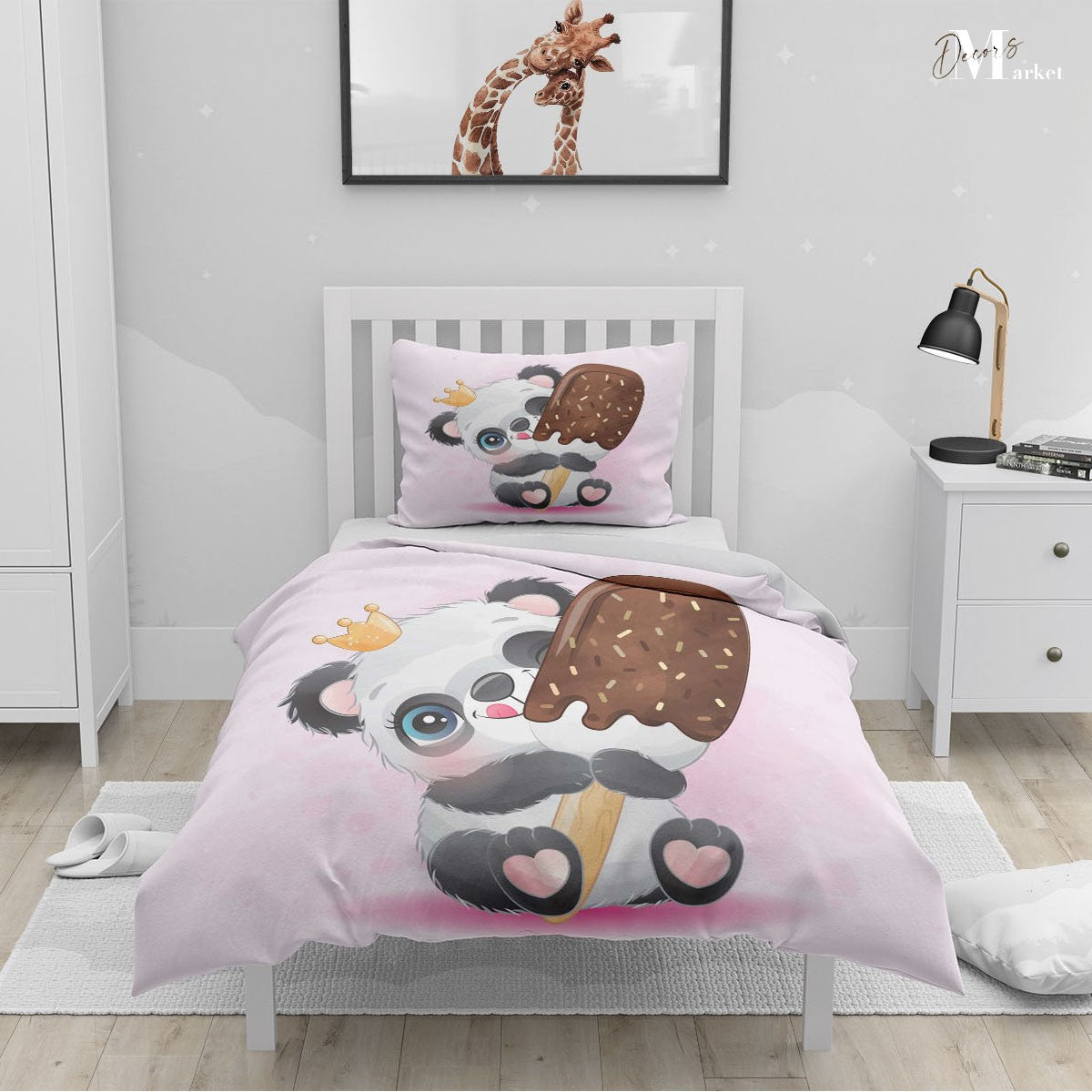 Panda Ice Cream Duvet Cover Set w Pillow Cover, Pink Kids Animal 3D Quilt Cover, Single Double Queen King Size Doona Cover