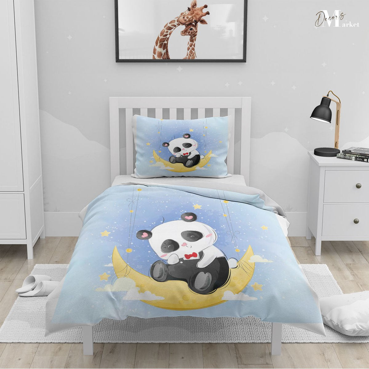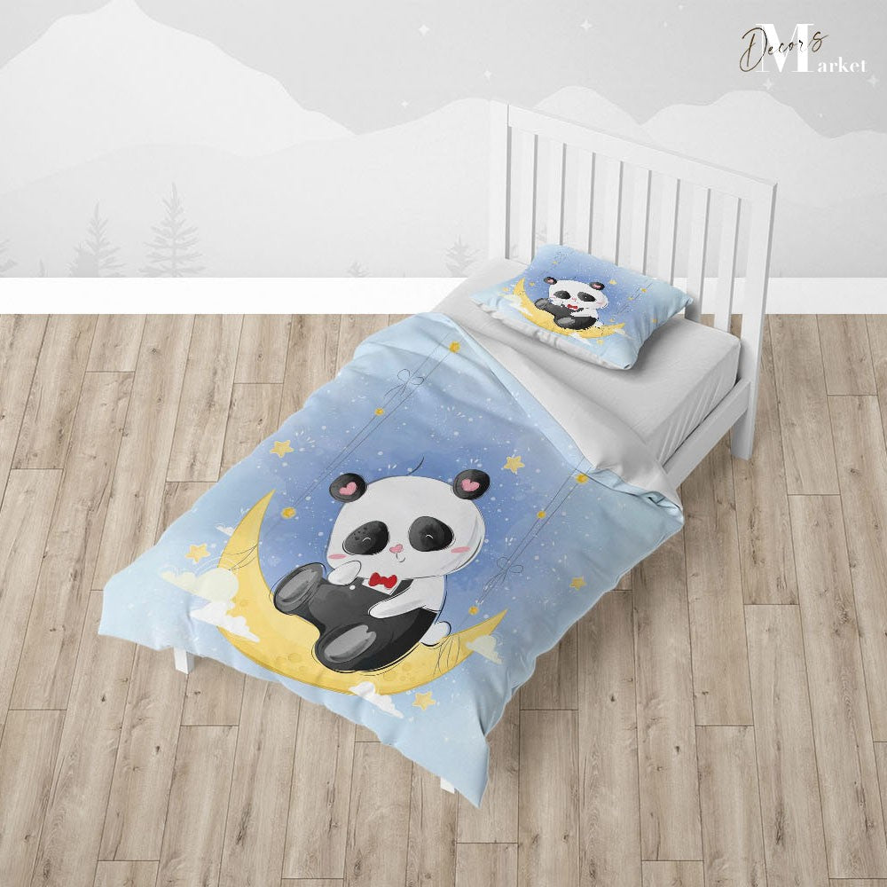 Panda Moon Star Duvet Cover Set w Pillow Cover, Blue Kids Cartoon 3D Quilt Cover, Single Double Queen King Size Doona Cover