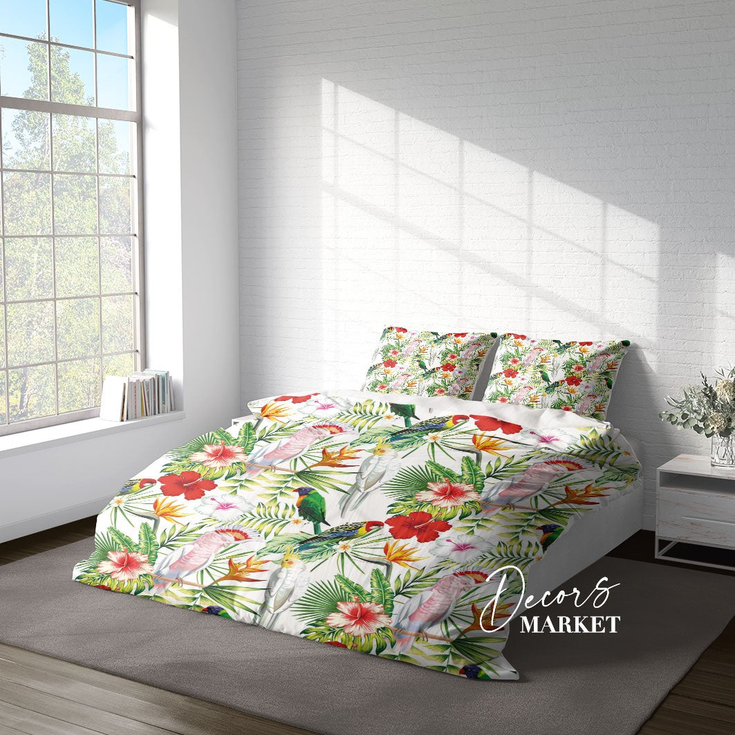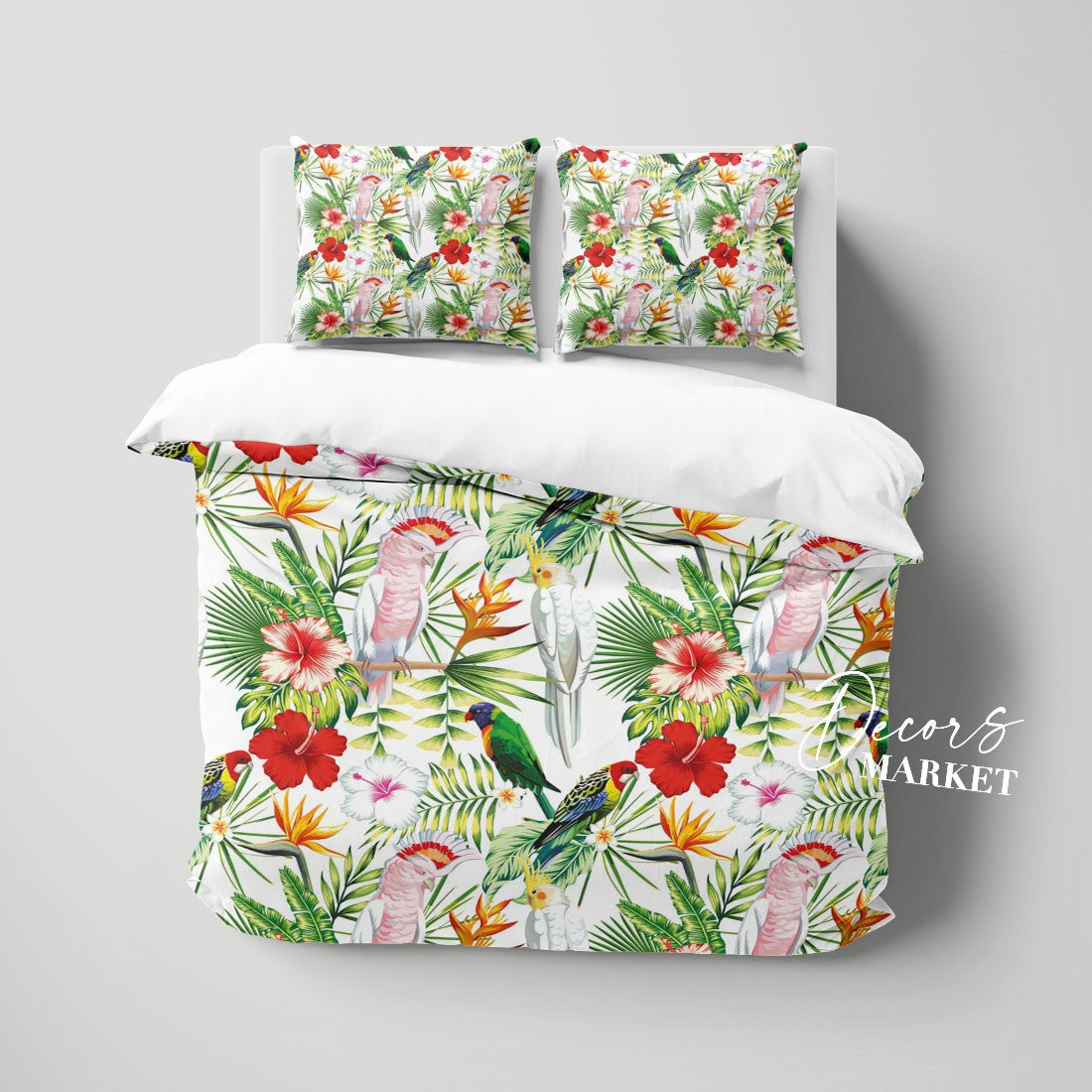 Parrot Leaves Duvet Cover Set w Pillowcases, Green Floral Patterns 3D Quilt Cover, 3pc Single Double Queen King Size Doona Cover