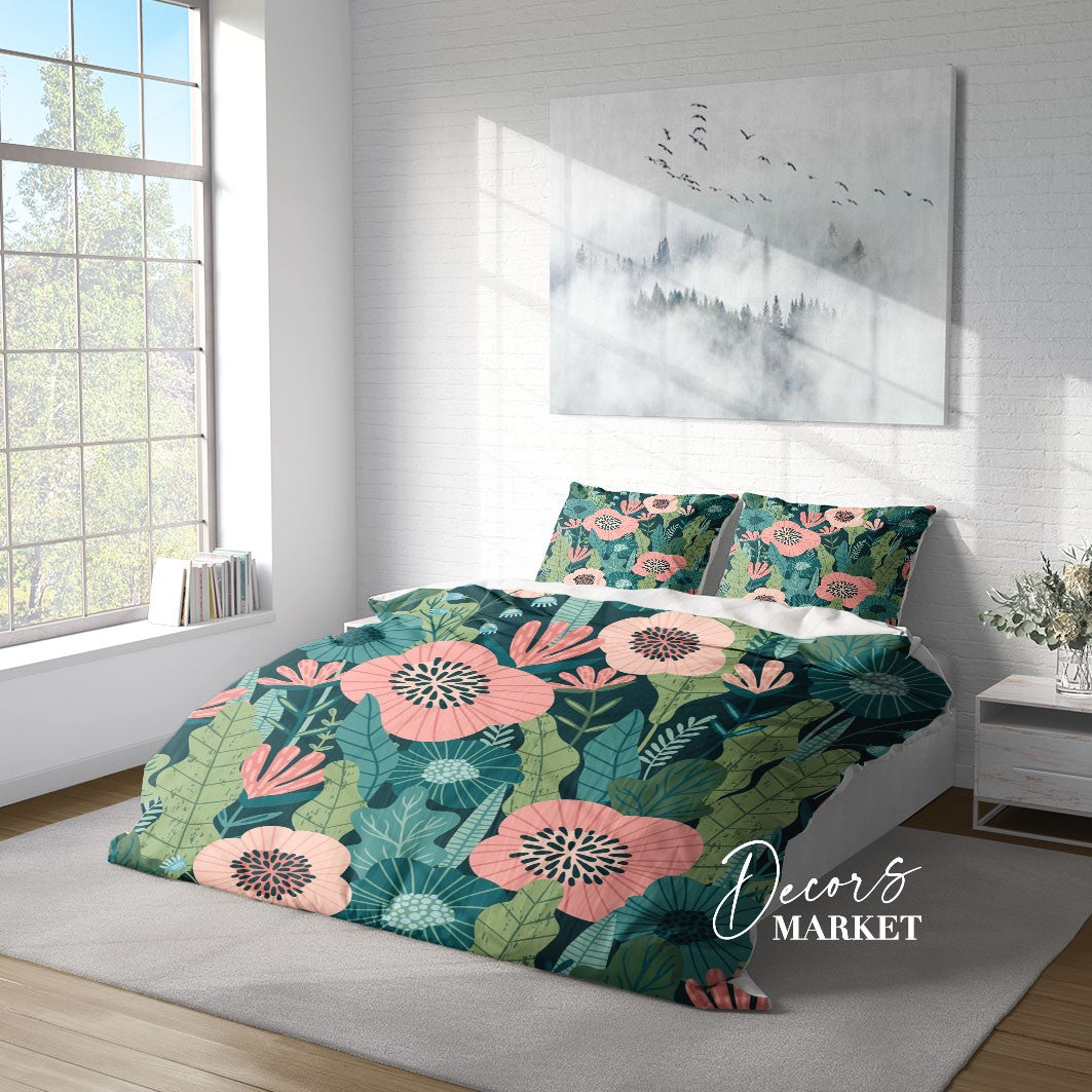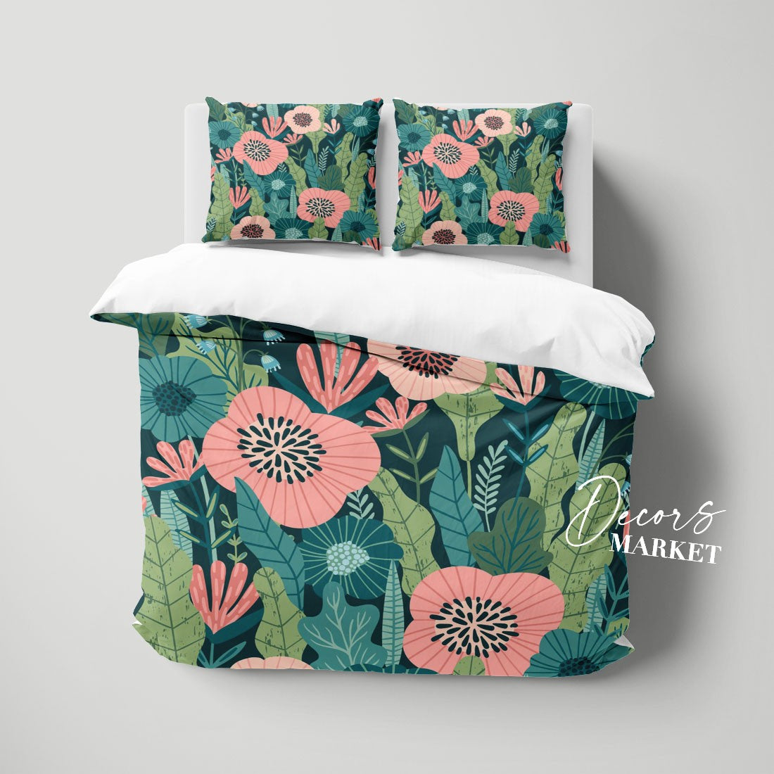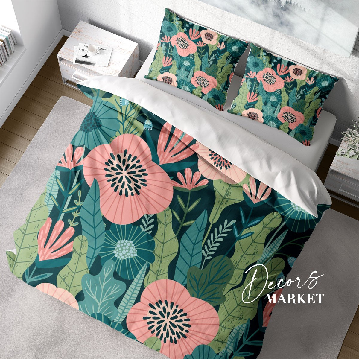 Pastel Calendula Leaf Duvet Cover Set w Pillowcases, Green Floral Patterns 3D Quilt Cover, 3pc Single Double Queen King Size Doona Cover