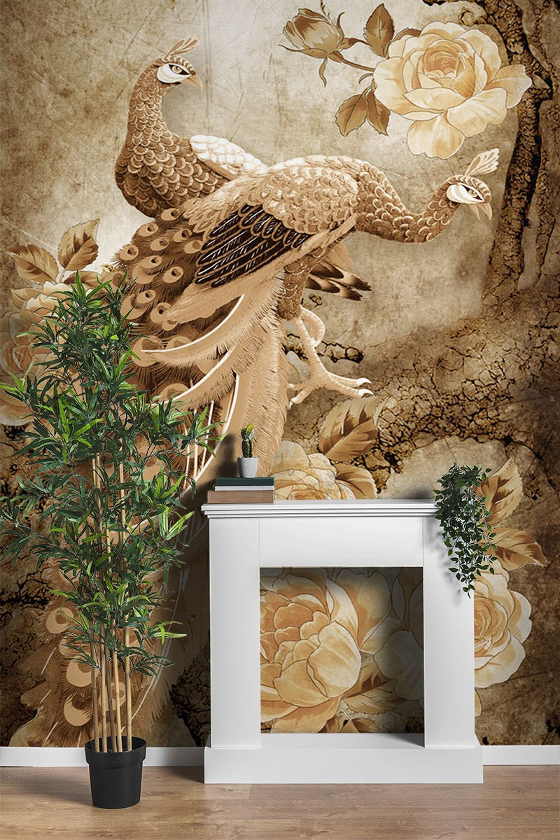 Peacock Peony Tree Art Chinoiserie Multicolour Wallpaper Mural,Self-Adhesive Peel And Stick 3D Wall Paper,Removable Designer Wall Decor