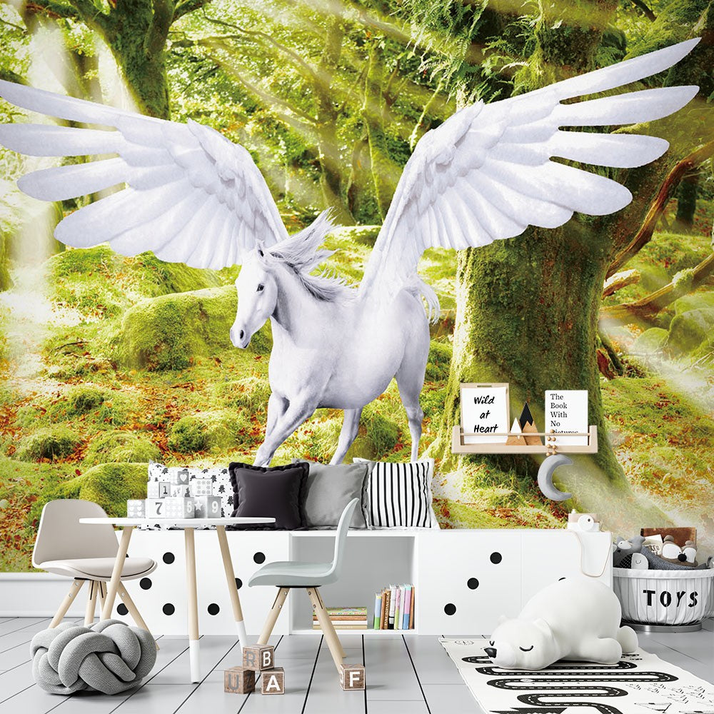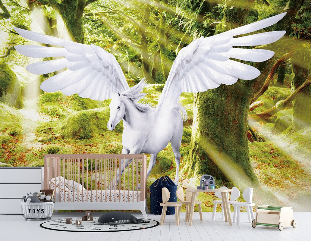 Pegasus Unicorn Kids Fantasy White Wallpaper Mural,Self-Adhesive Peel And Stick 3D Wall Decal,Designer Australian Company Wall Decor