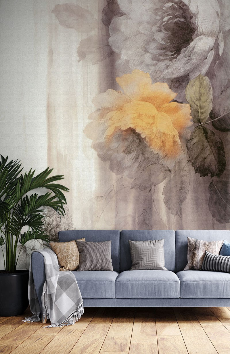 Pencil Dutch Flowers Art Chinoiserie Yellow Wallpaper Mural,Self-Adhesive Peel And Stick 3D Wall Mural,Designer Removable Wall Decor