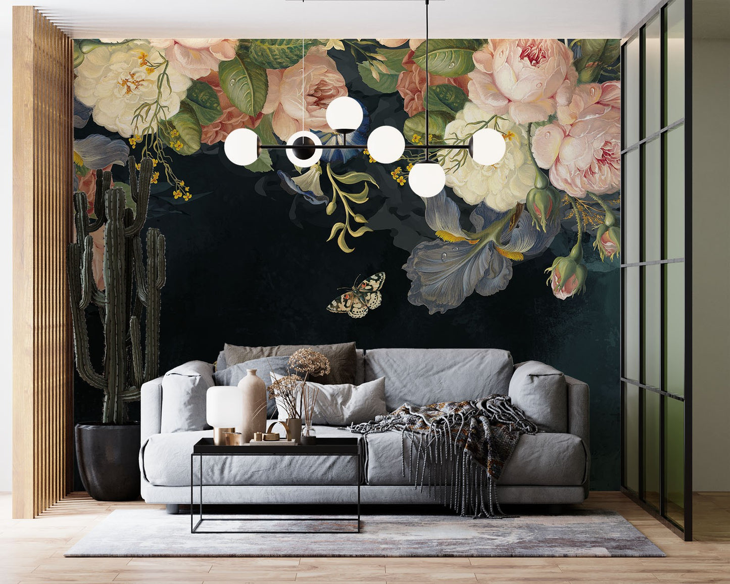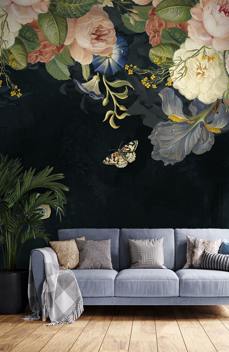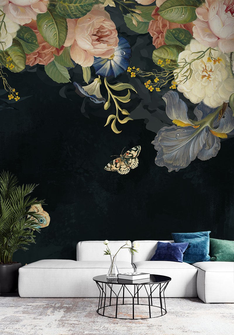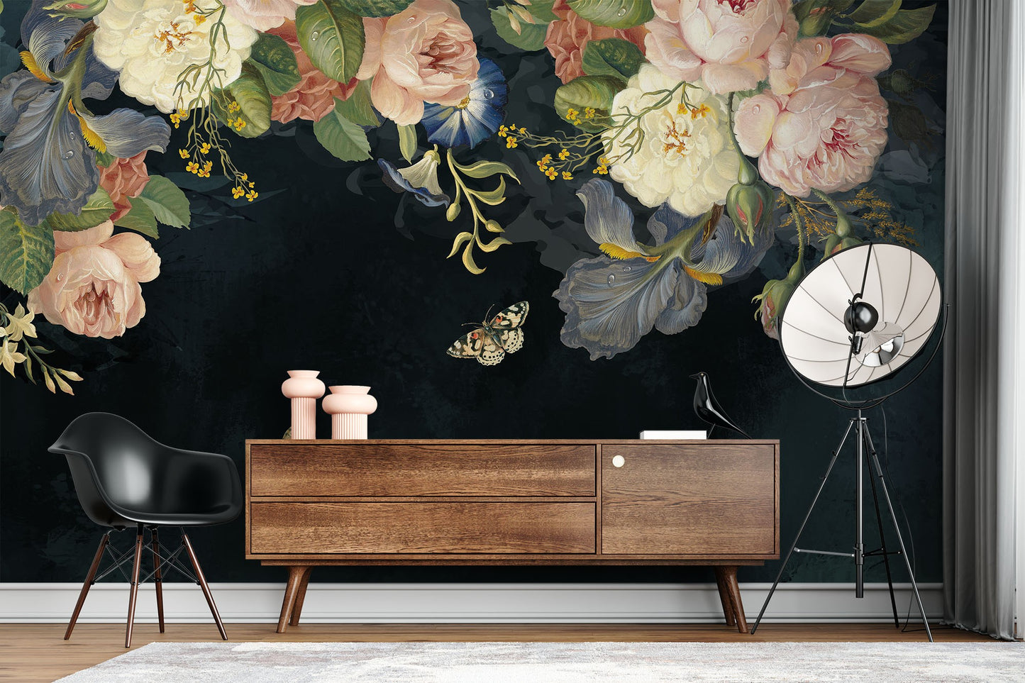 Peony Butterfly Floral Flowers Dark Wallpaper Mural