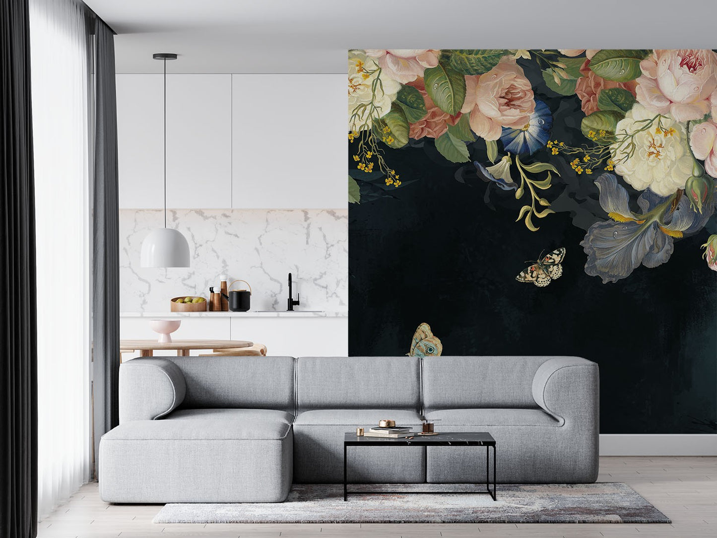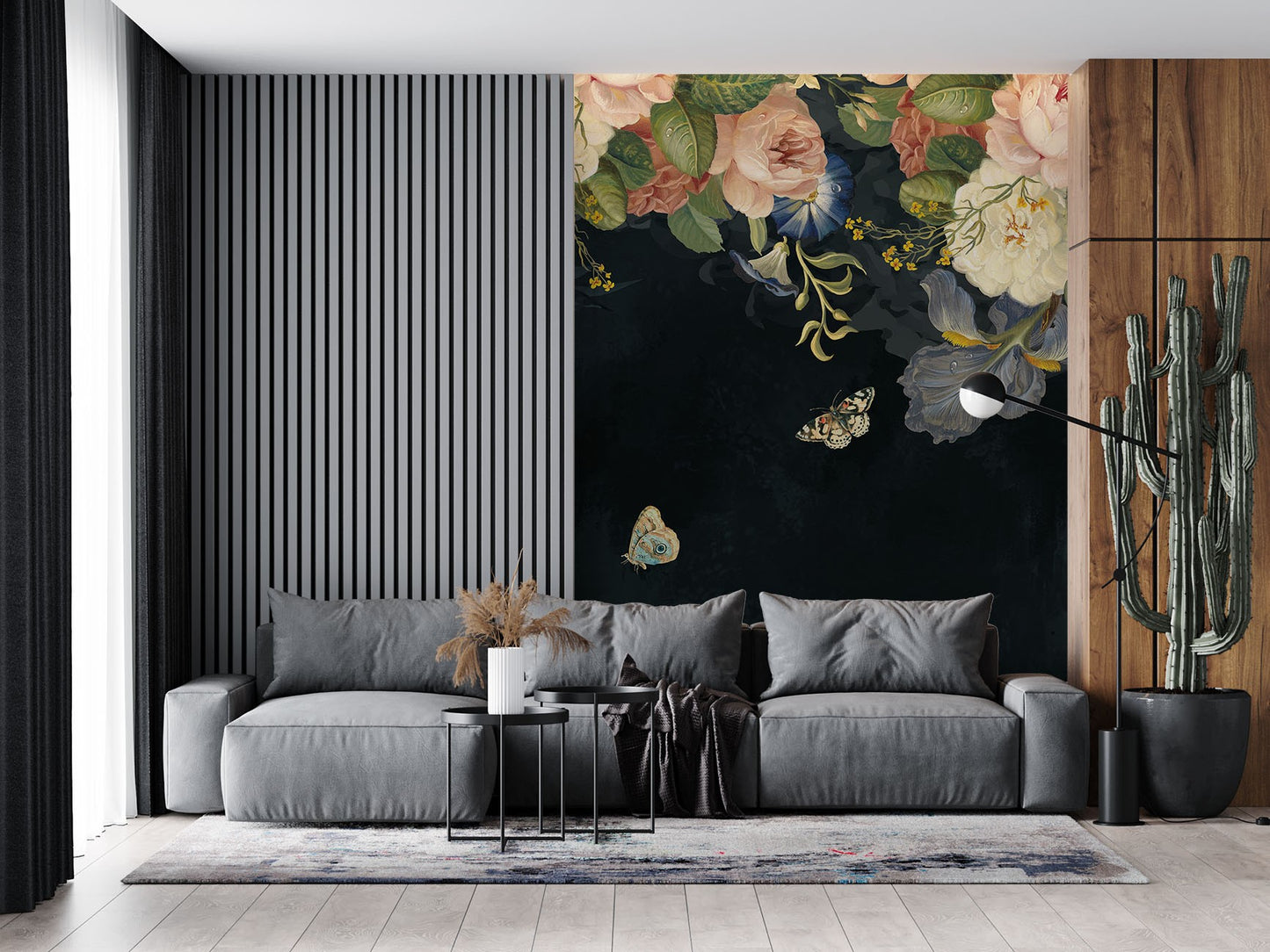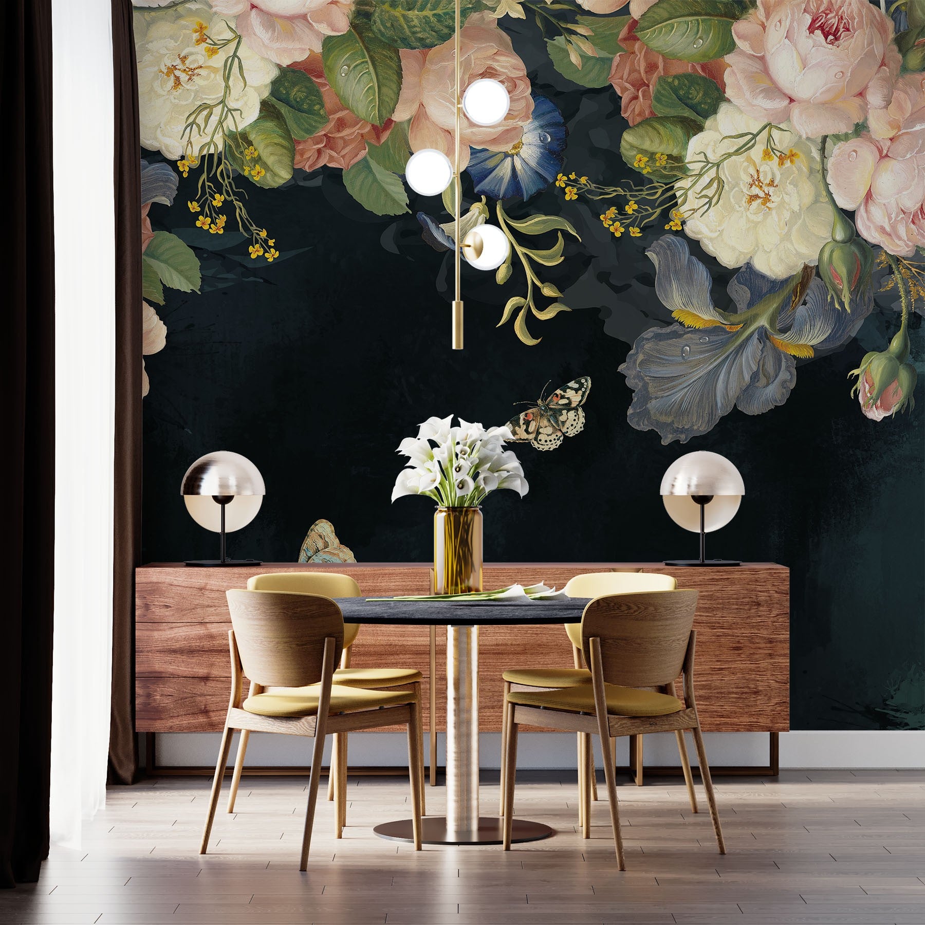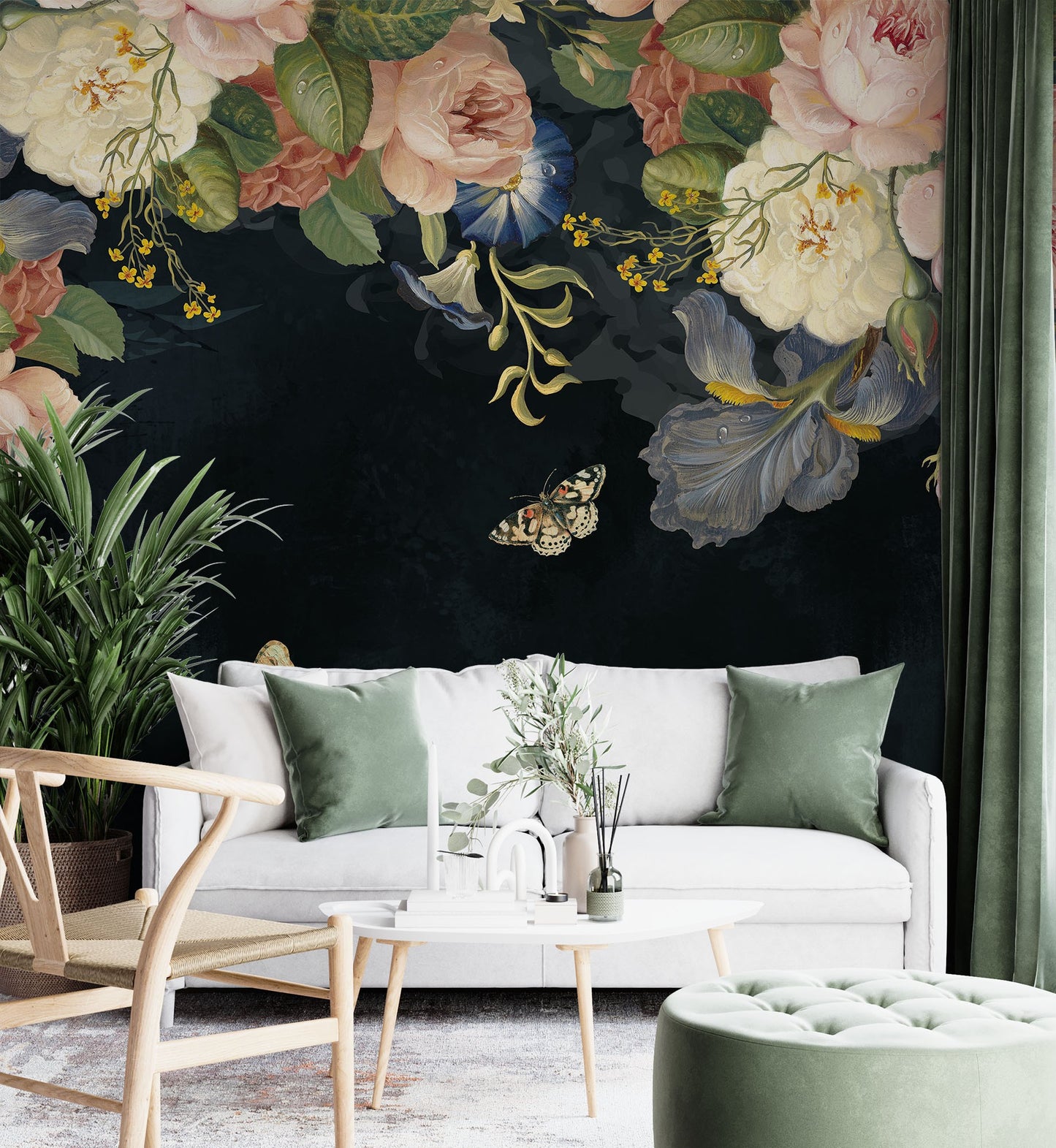 Peony Butterfly Floral Flowers Dark Wallpaper Mural