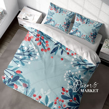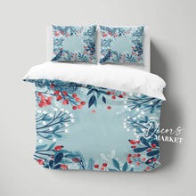 Pine Branches Berries Duvet Cover Set w Pillowcases, Blue Floral Leaves 3D Quilt Cover, 3pc Single Double Queen King Size Doona Cover