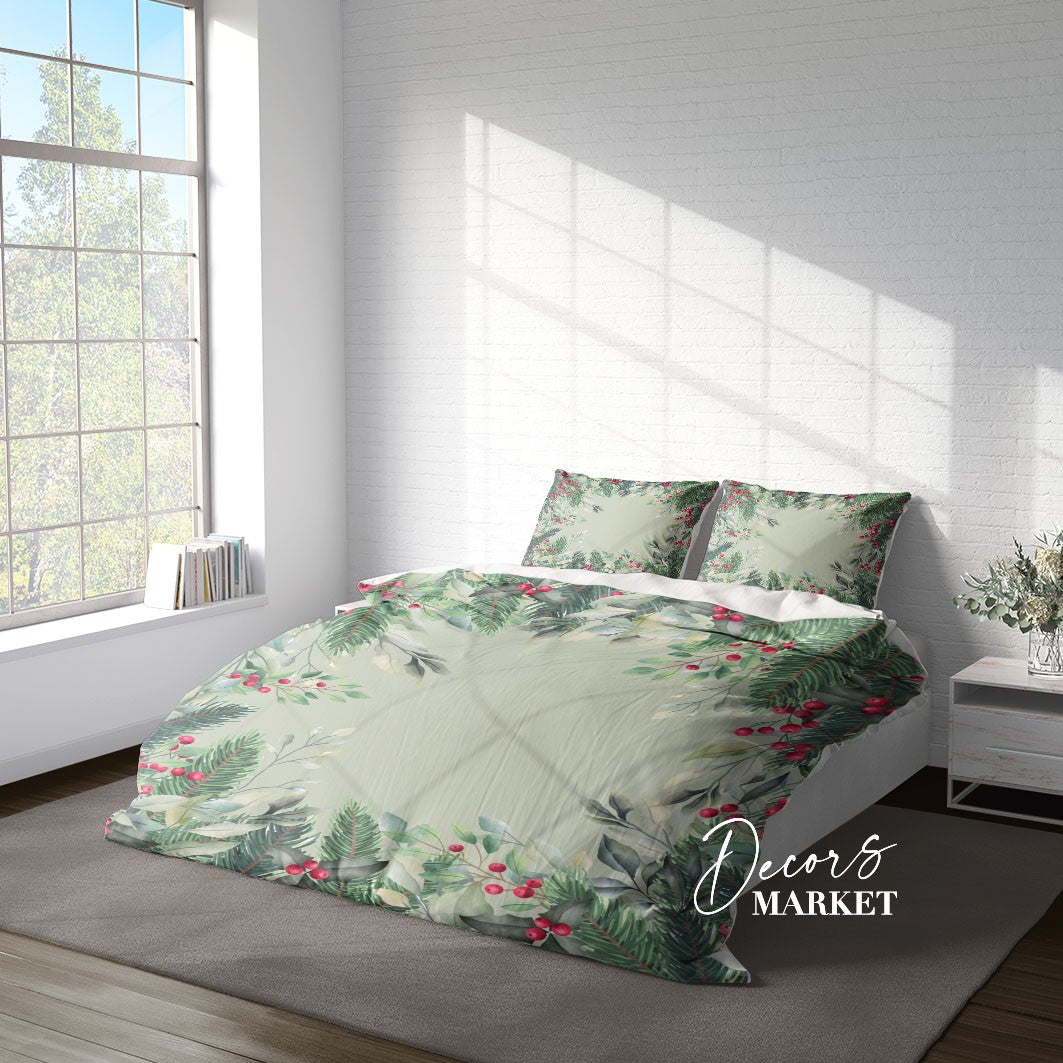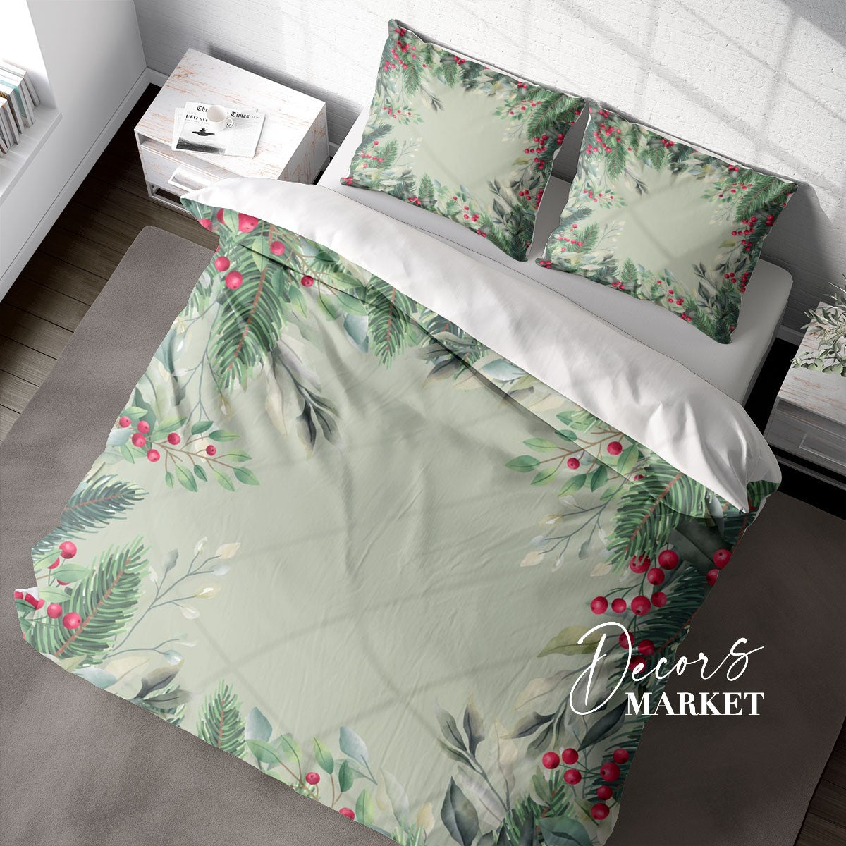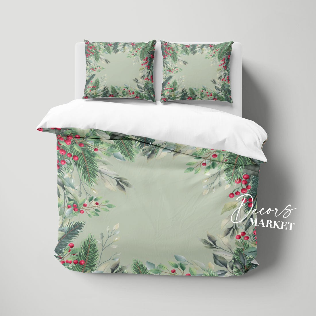 Pine Branches Berries Duvet Cover Set w Pillowcases, Green Floral Leaves 3D Quilt Cover, 3pc Single Double Queen King Size Doona Cover