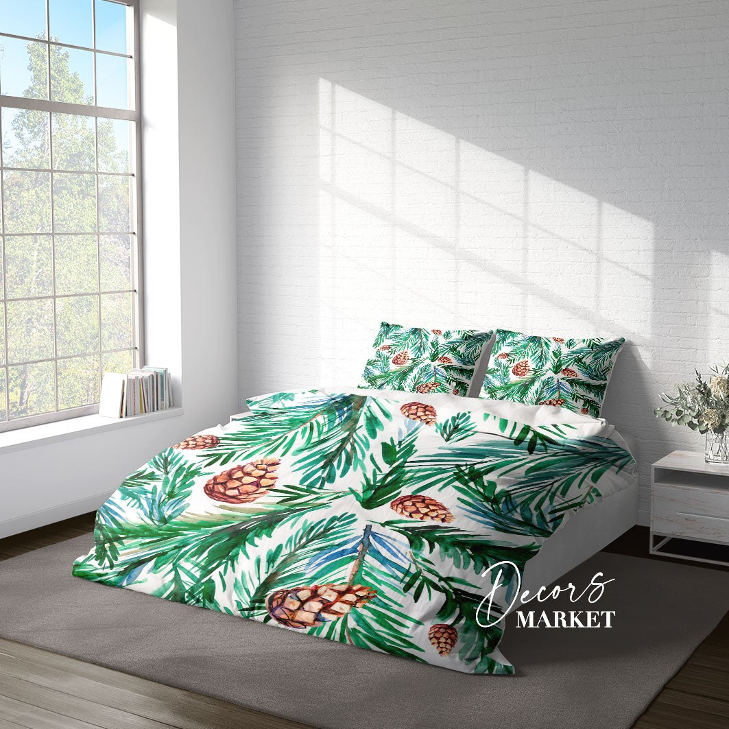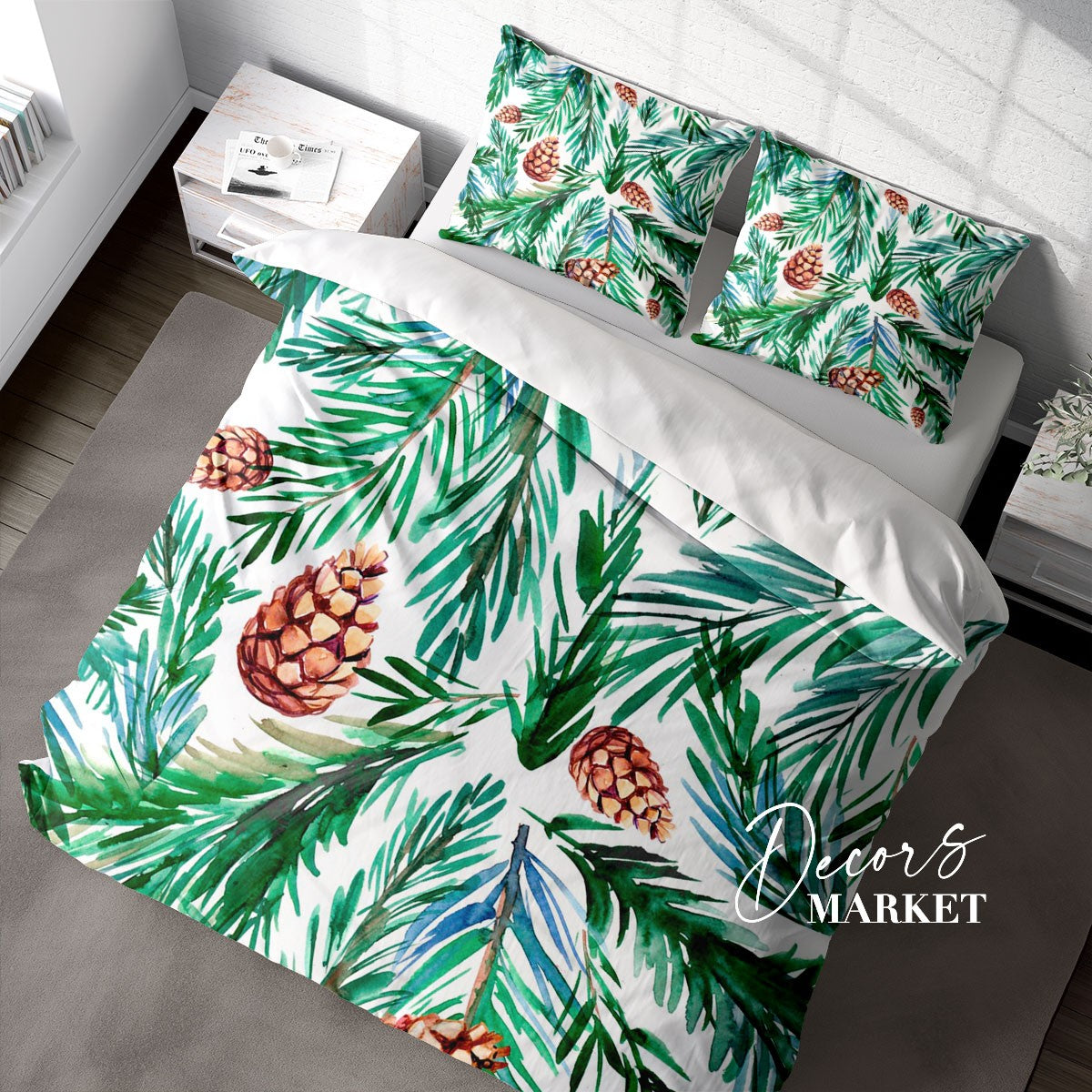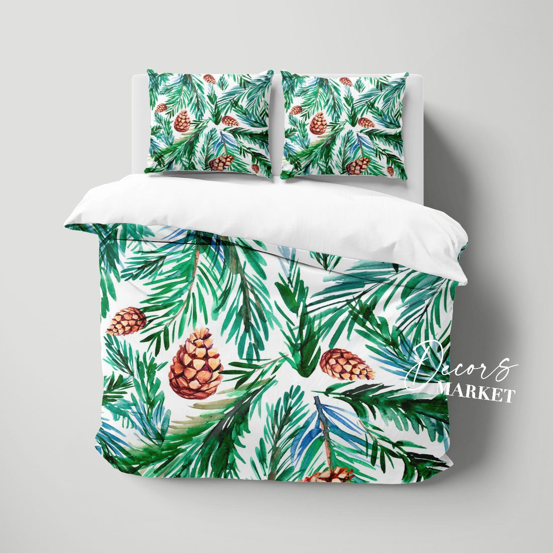 Pine Cones Leaf Duvet Cover Set w Pillowcases, Green Floral Patterns 3D Quilt Cover, 3pc Single Double Queen King Size Doona Cover