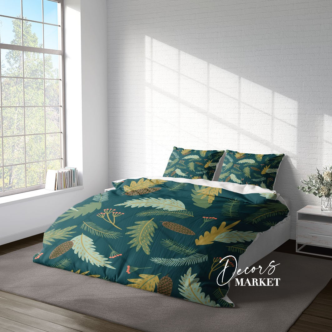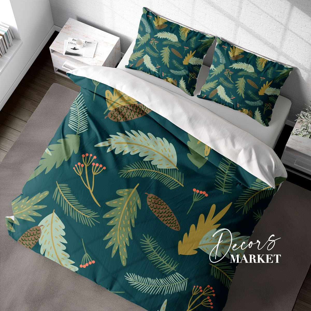 Pine Needle Berries Duvet Cover Set w Pillowcases, Green Floral Leaves 3D Quilt Cover, 3pc Single Double Queen King Size Doona Cover