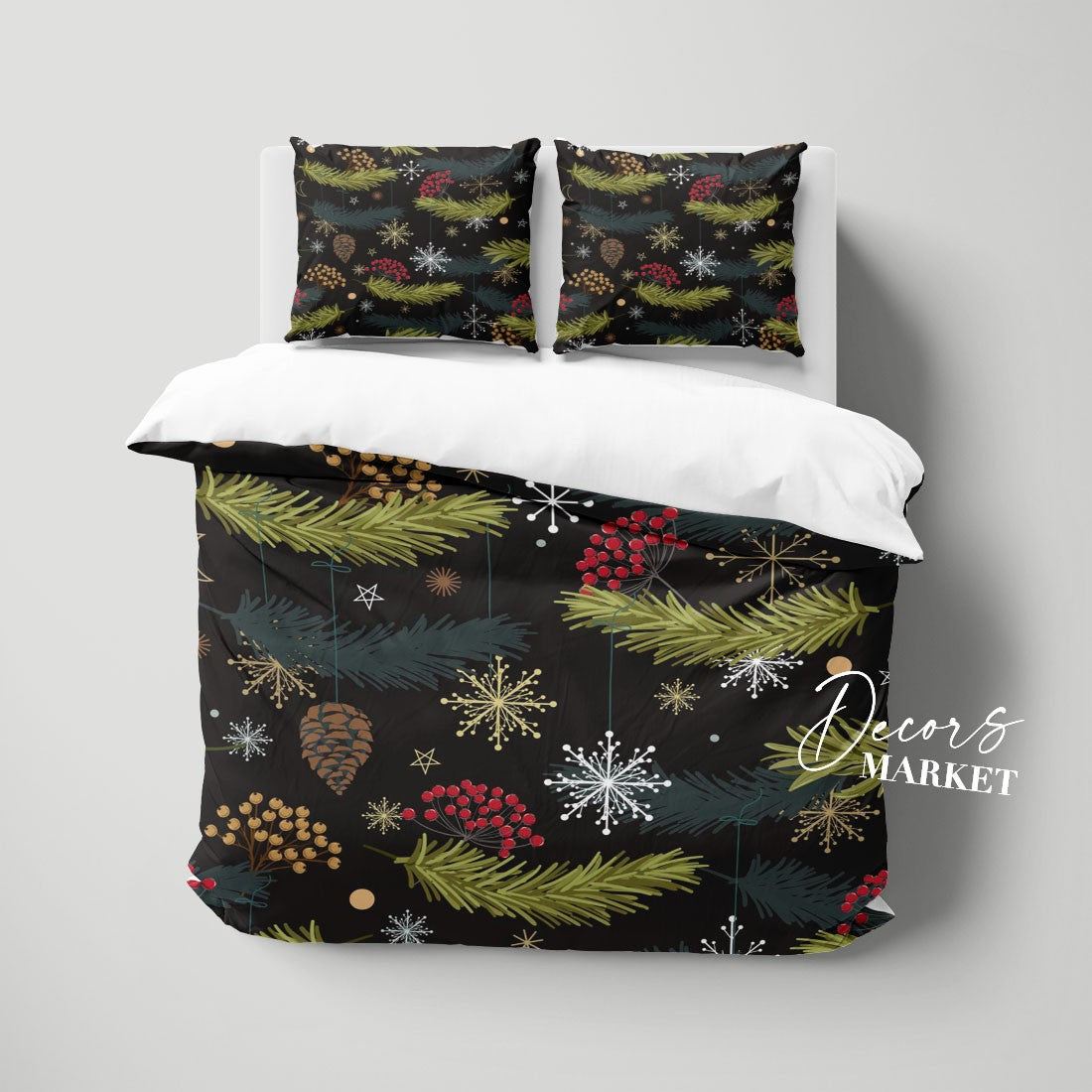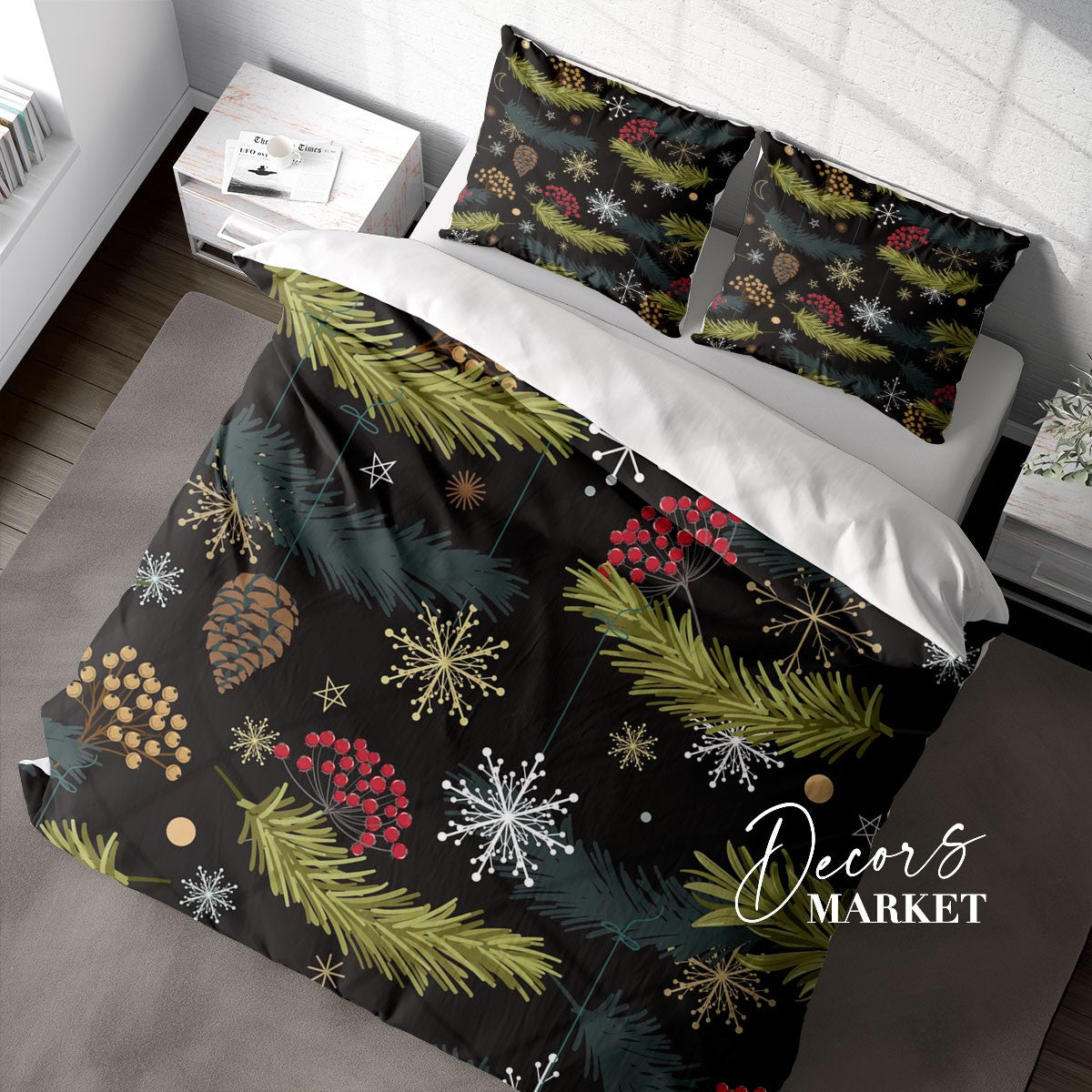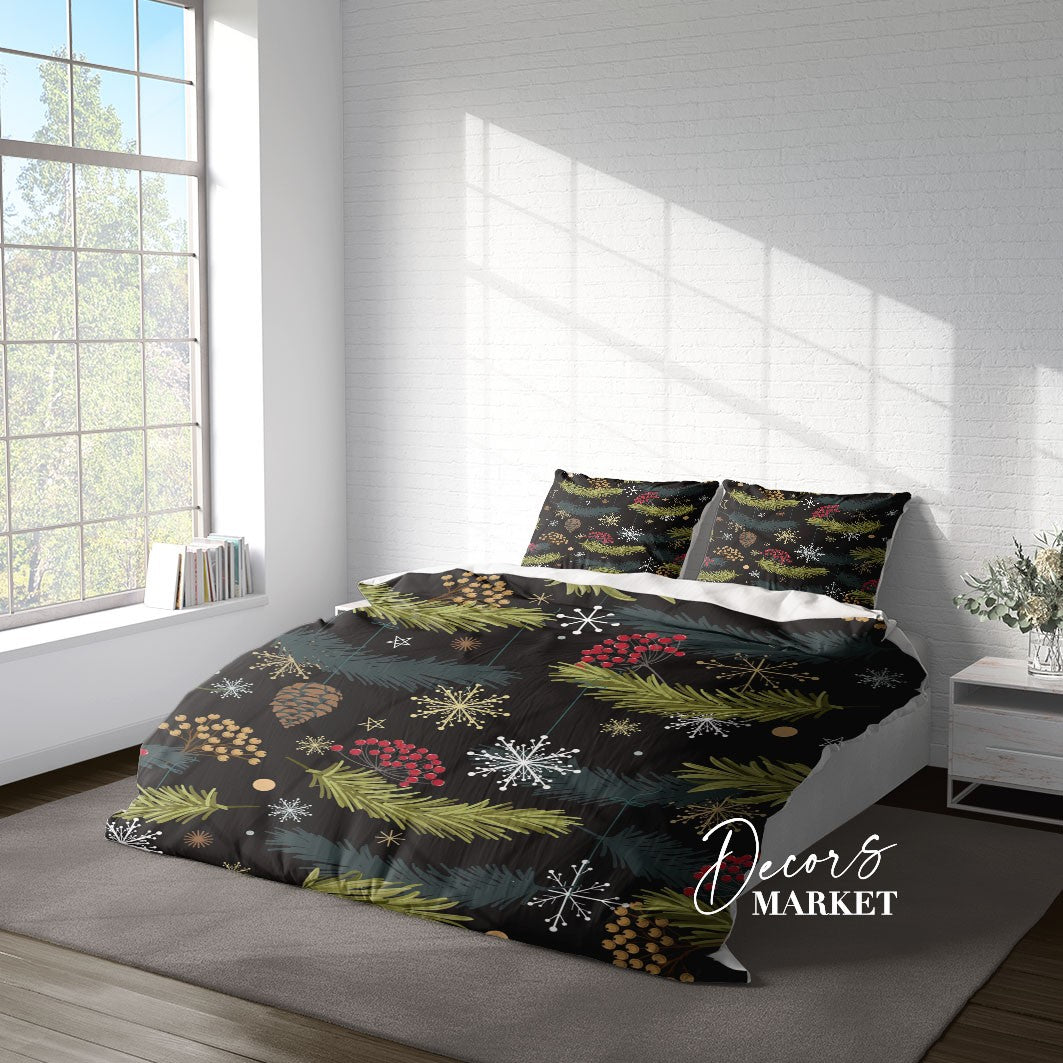 Pine Needles Berries Duvet Cover Set w Pillowcases, Green Floral Leaves 3D Quilt Cover, 3pc Single Double Queen King Size Doona Cover