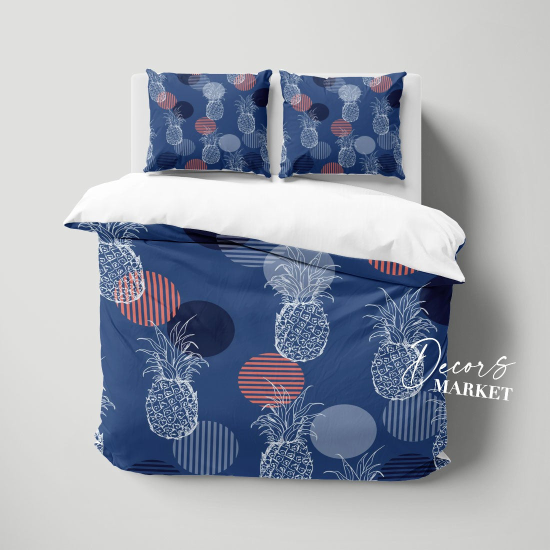 Pineapples Polka Dots Duvet Cover Set w Pillowcases, Blue Floral Patterns 3D Quilt Cover, 3pc Single Double Queen King Size Doona Cover