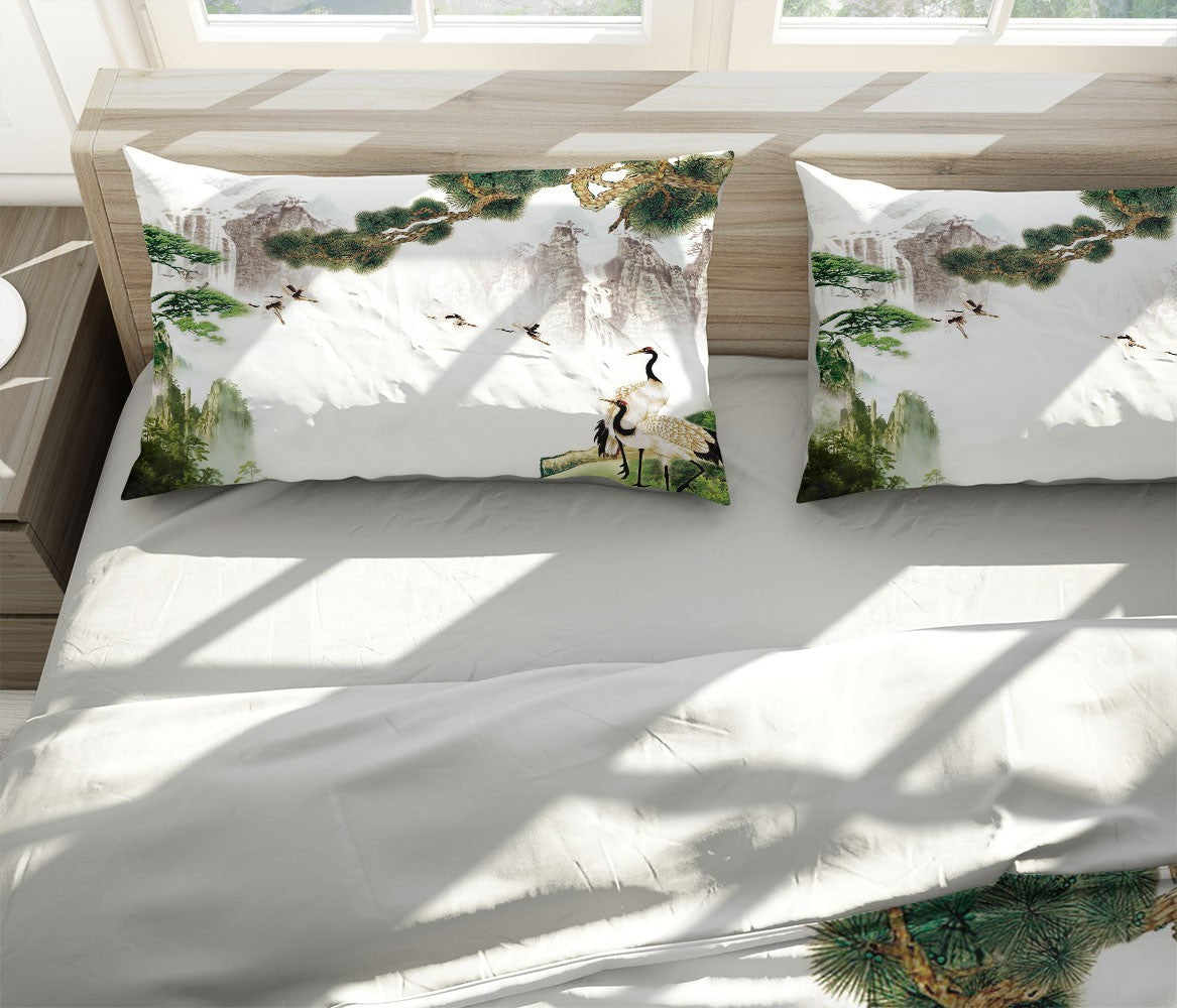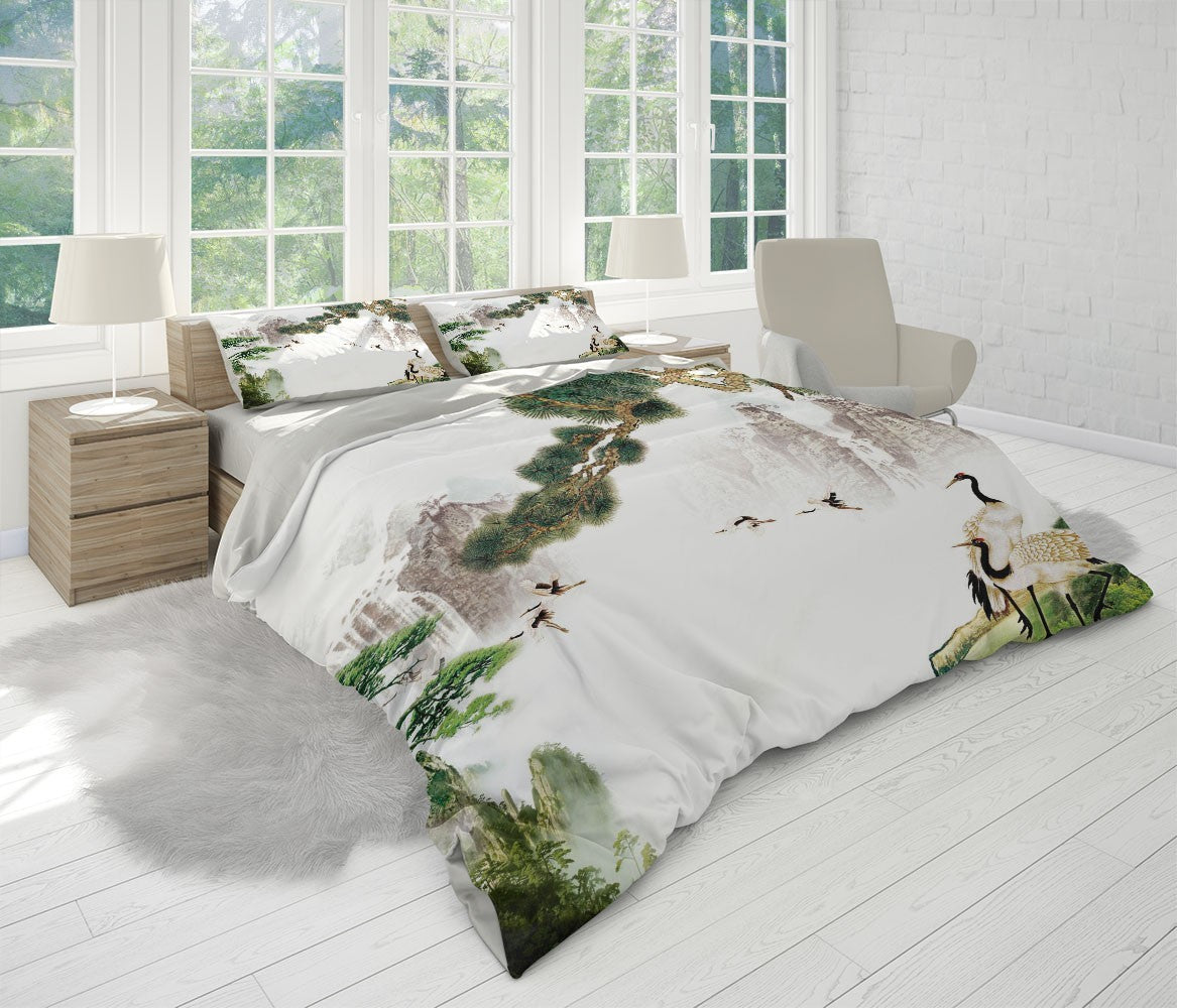 Pines Crane Duvet Cover Set W Pillow Cover, Green Art Chinoiserie 3D Quilt Cover, Single Double Queen King Size Doona Cover