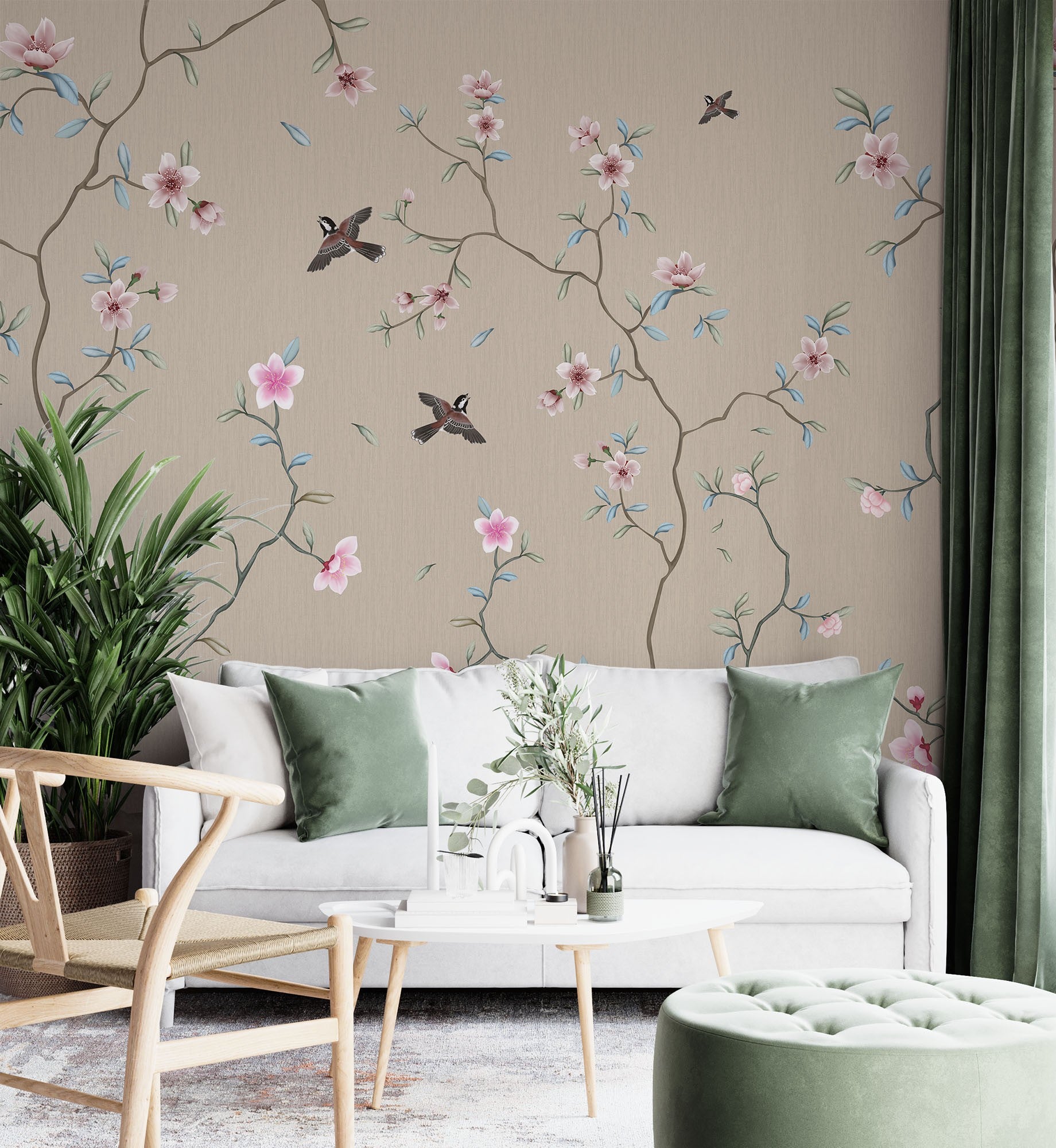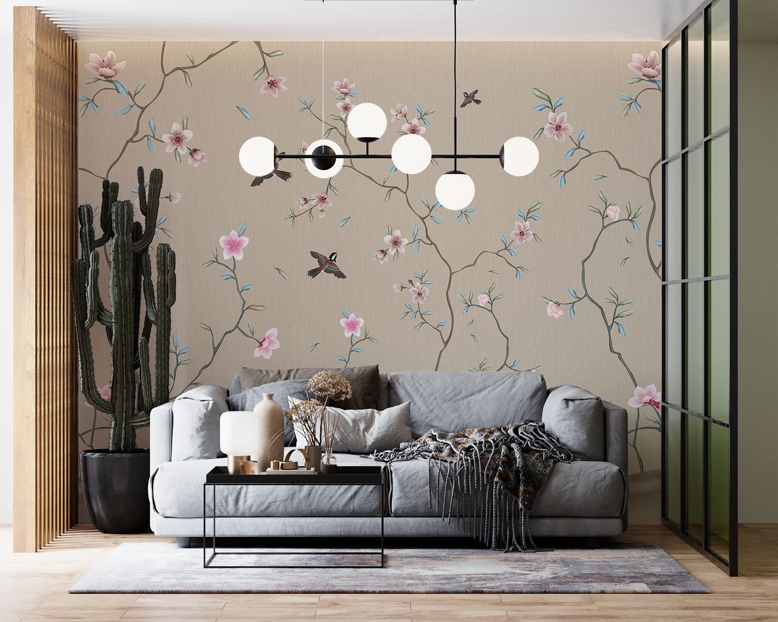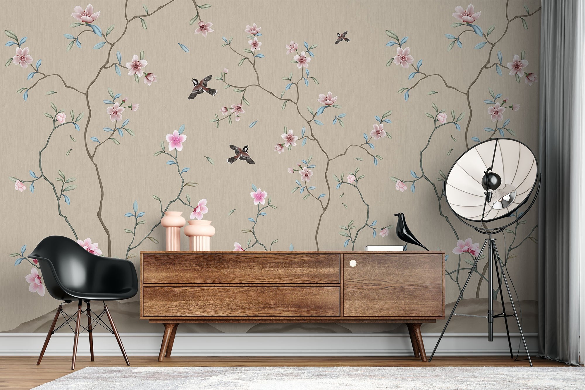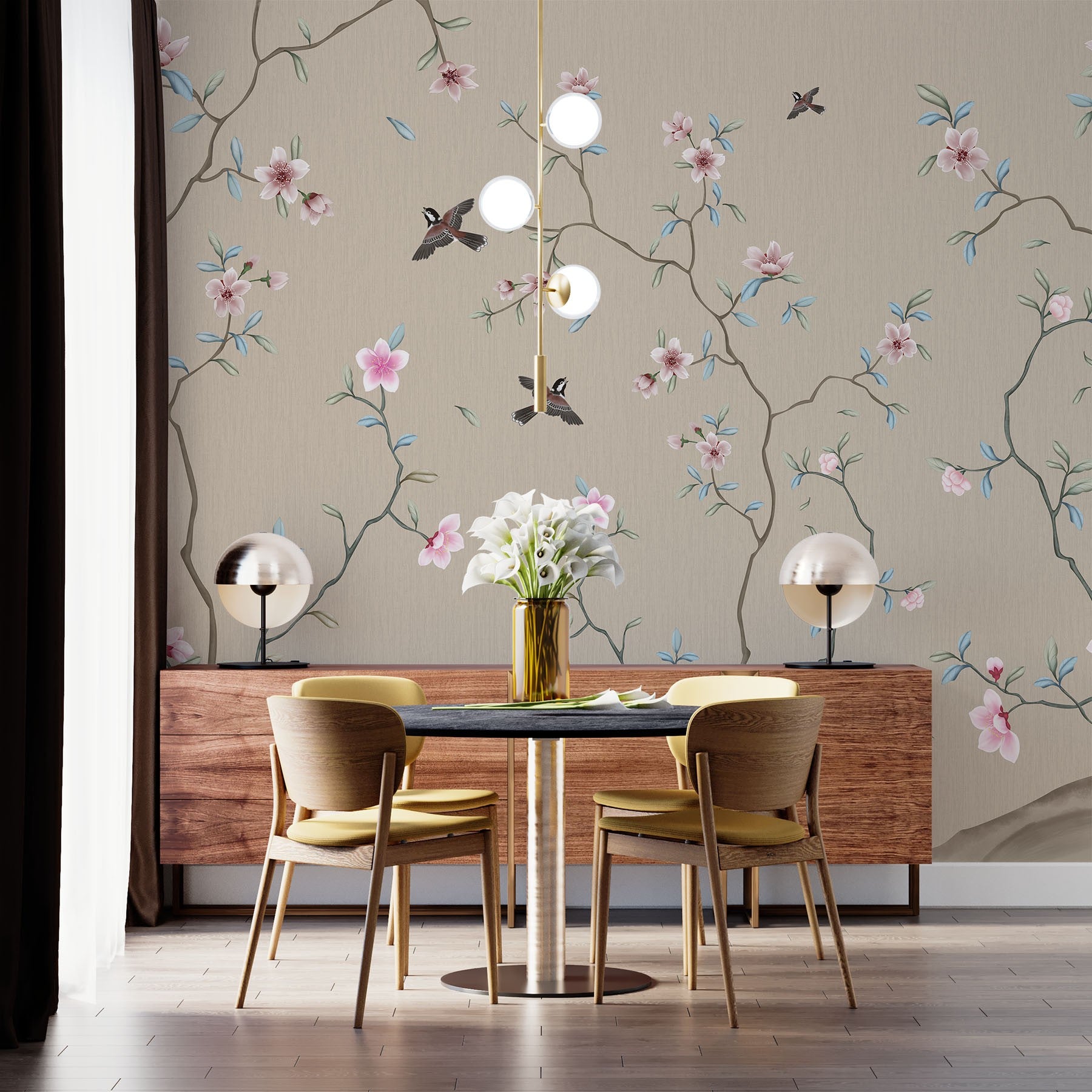 Pink Floral Art Chinoiserie Creamy Wallpaper Mural