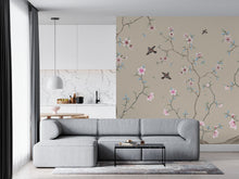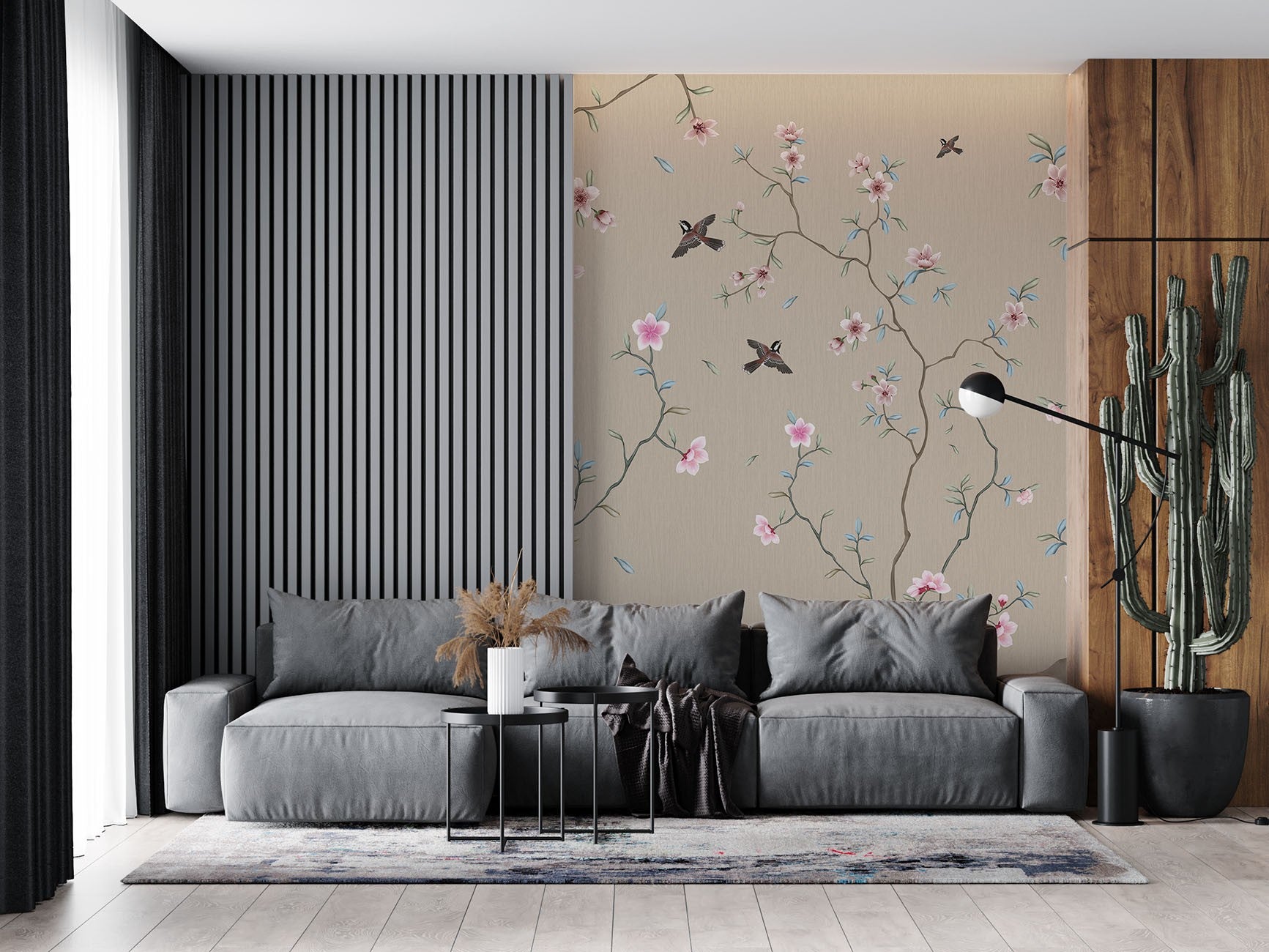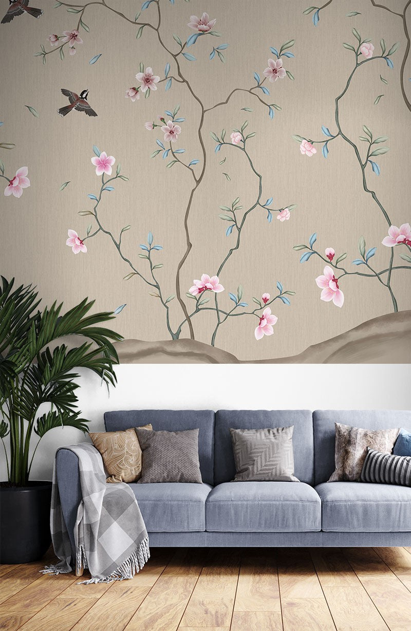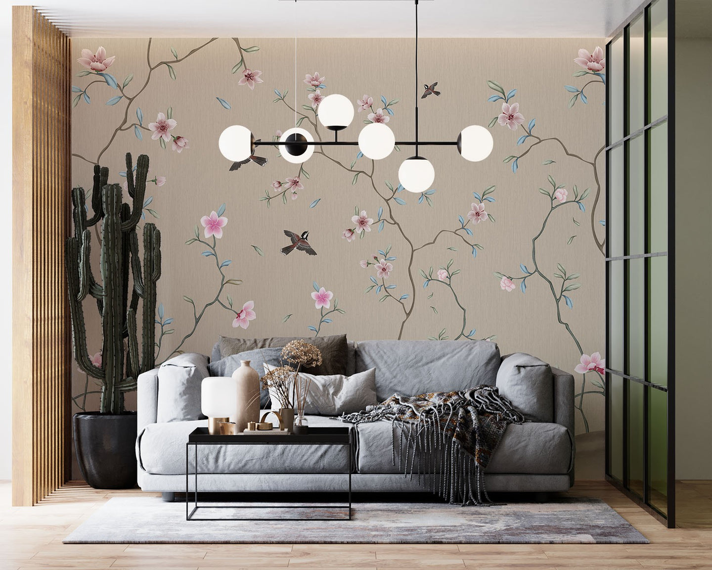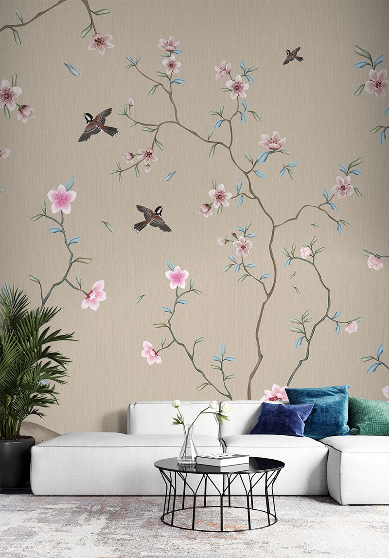 Pink Floral Art Chinoiserie Creamy Wallpaper Mural