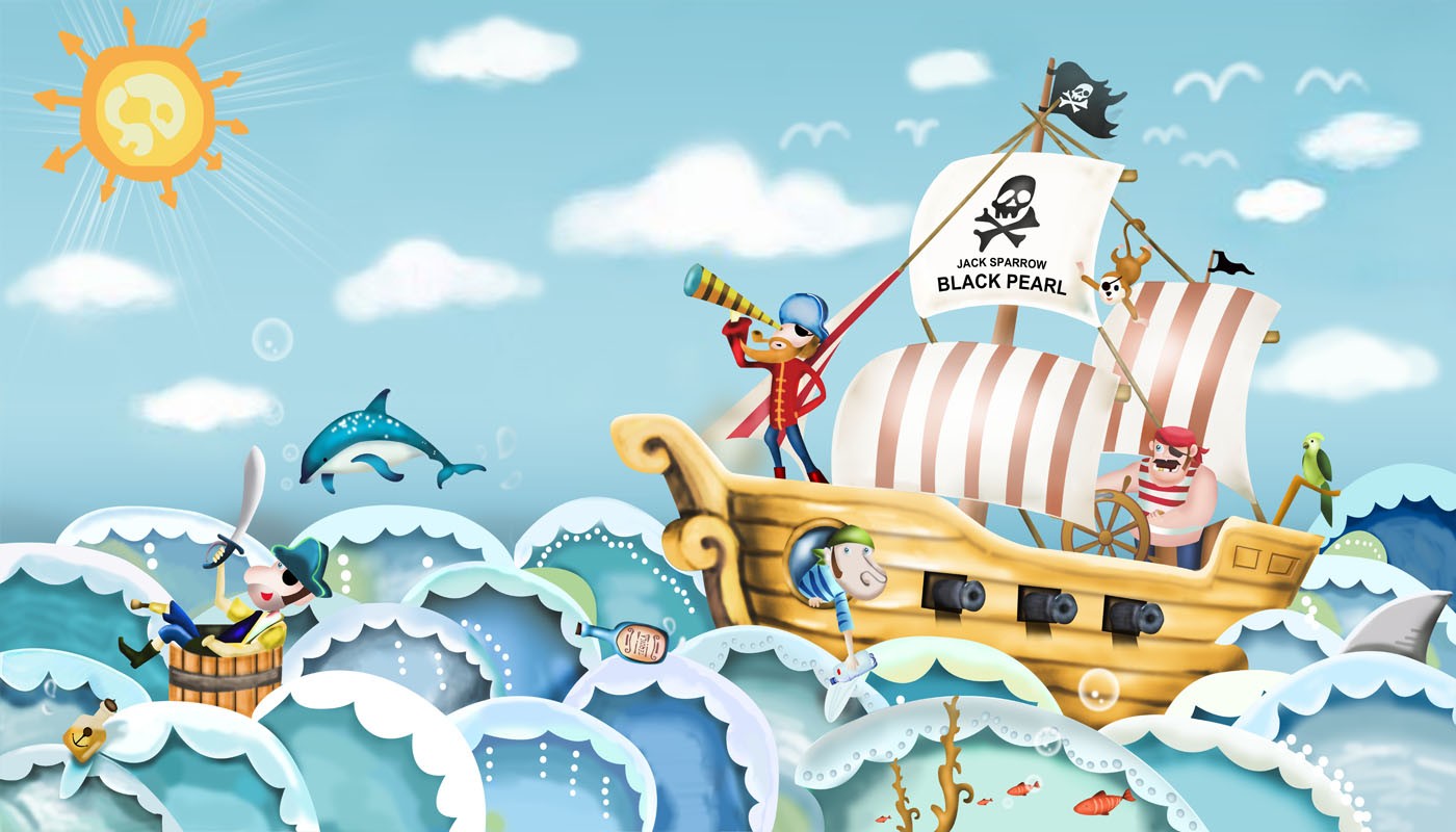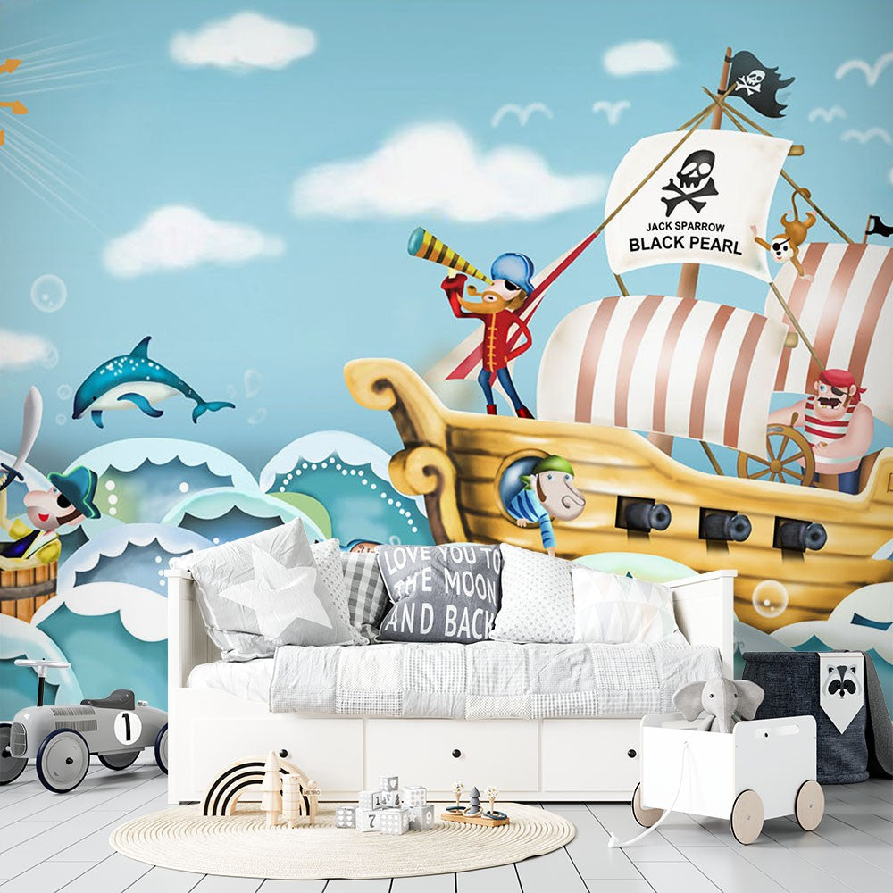 Pirate Ship Kids Cartoon Blue Wallpaper Mural,Self-Adhesive Peel And Stick 3D Wall Art,Designer Bedroom Wall Decor