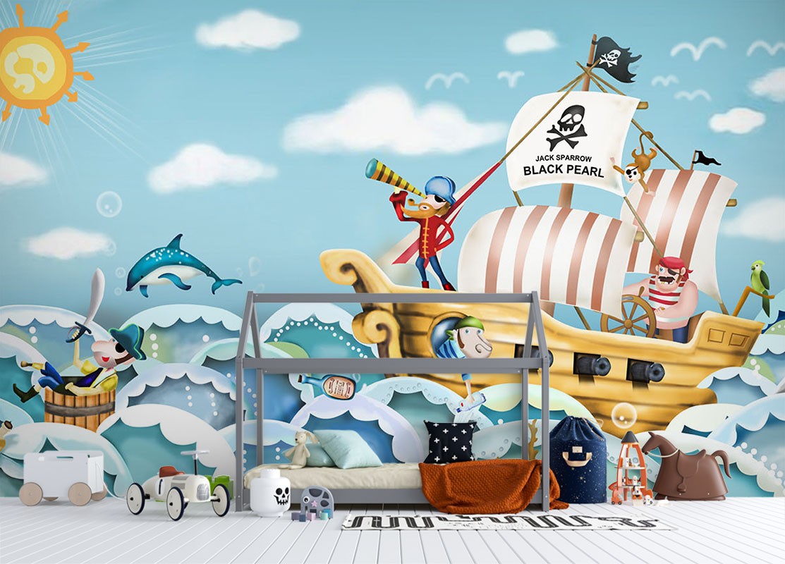 Pirates Dolphin Kids Cartoon Blue Wallpaper Mural,Self-Adhesive Peel And Stick 3D Wall Paper,Bedroom Australian Company Wall Decor