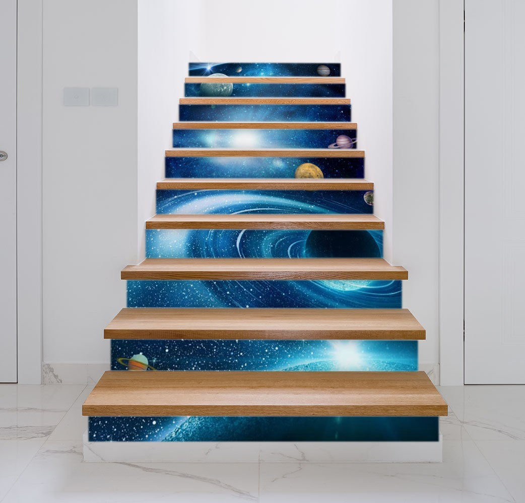 Planet Space Nature Blue Stair Riser Decals, Waterproof Removable Staircase Decals, Vinyl Peel And Stick Stairs Decal Stickers