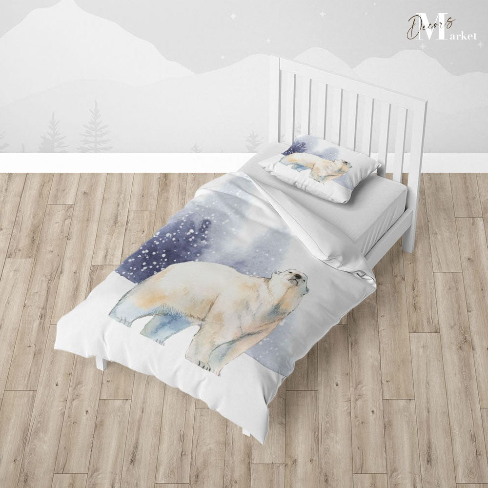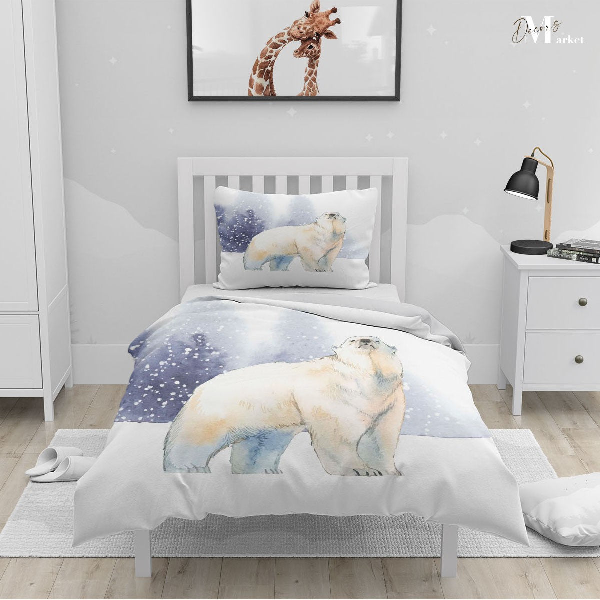 Polar Bear Nursery Duvet Cover Set w Pillow Cover, White Animals Wild Animals 3D Quilt Cover, Single Double Queen King Size Doona Cover