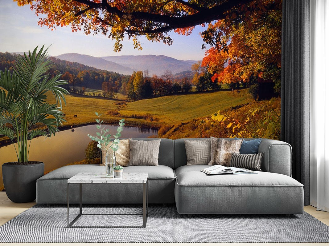 Prairie Lake Forest Seasons Gold Wallpaper Mural,Self-Adhesive Peel And Stick 3D Wall Decor,Designer Bedroom Wall Decor
