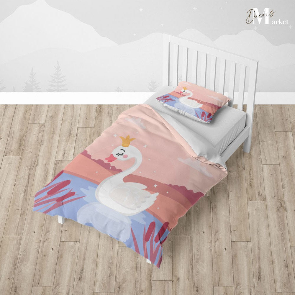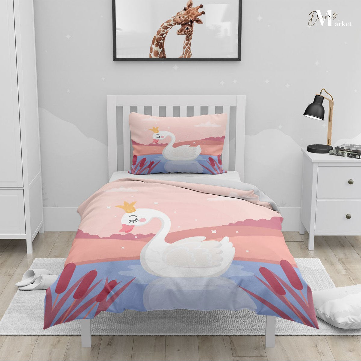 Princess Swan Lake Duvet Cover Set w Pillow Cover, Pink Kids Animal 3D Quilt Cover, Single Double Queen King Size Doona Cover