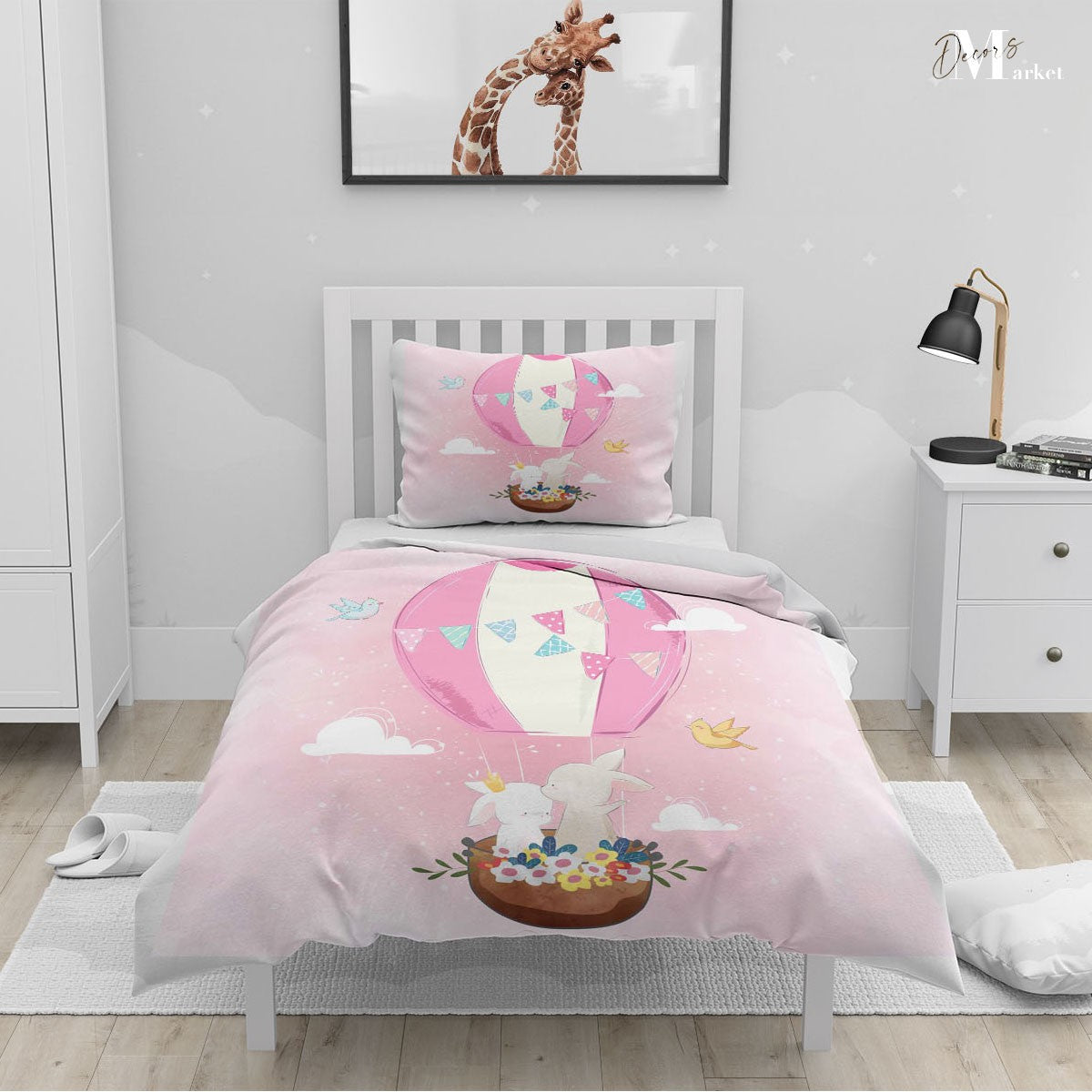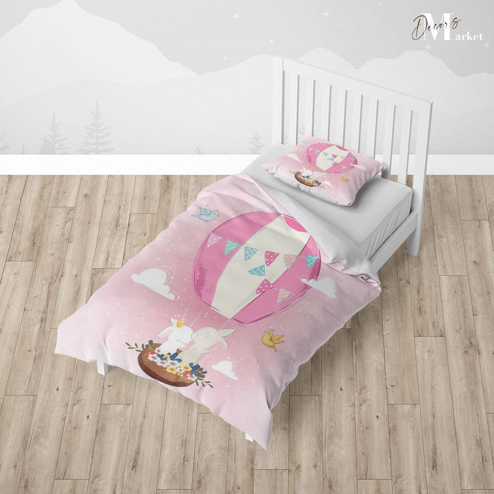 Rabbit Balloon Kiss Duvet Cover Set w Pillow Cover, Pink Kids Cartoon 3D Quilt Cover, Single Double Queen King Size Doona Cover