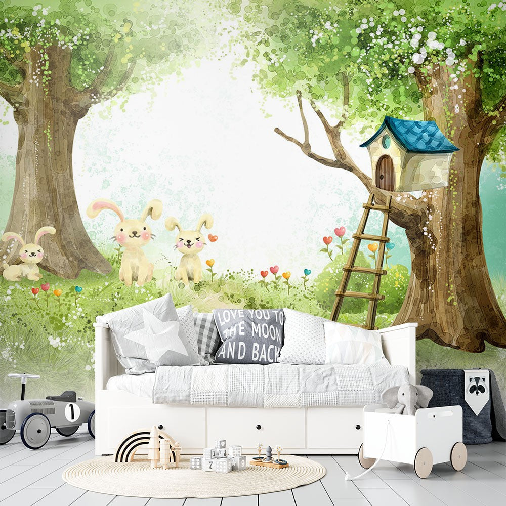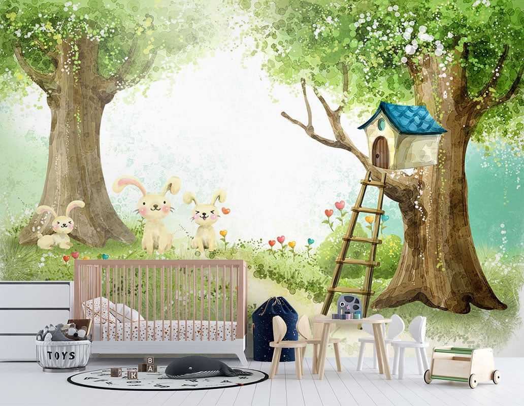 Rabbit Tree House Kids Animal Green Wallpaper Mural,Self-Adhesive Peel And Stick 3D Wall Decal,Australian Company Bedroom Wall Decor