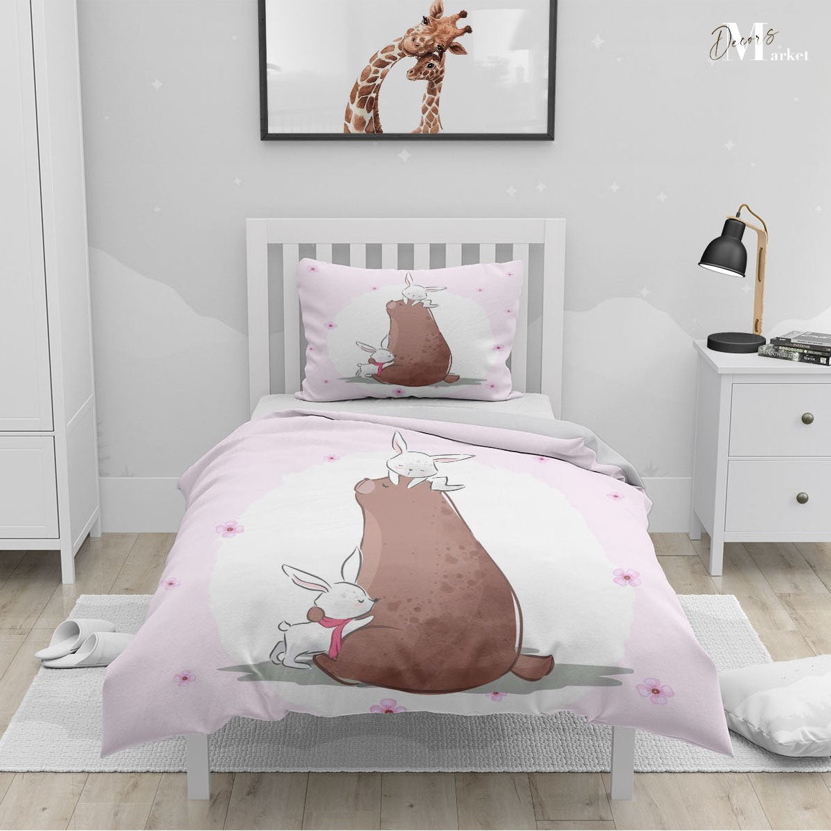 Rabbits Bear Duvet Cover Set w Pillow Cover, Brown Kids Cartoon 3D Quilt Cover, Single Double Queen King Size Doona Cover