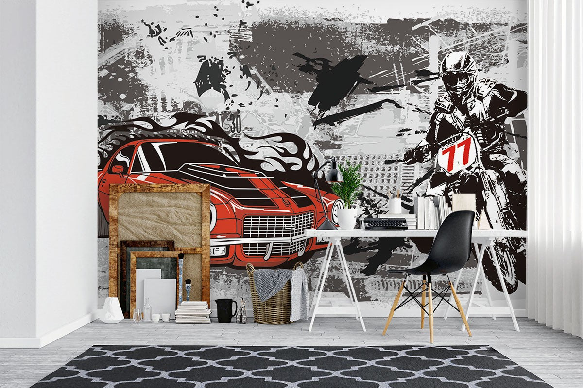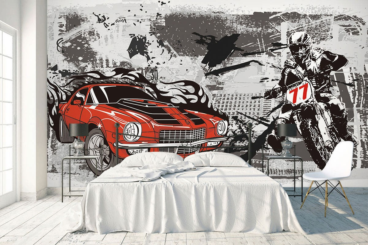 Racing Car Art Pop Art Black Wallpaper Mural,Self-Adhesive Peel And Stick 3D Wall Paper,Designer Australian Company Wall Decor