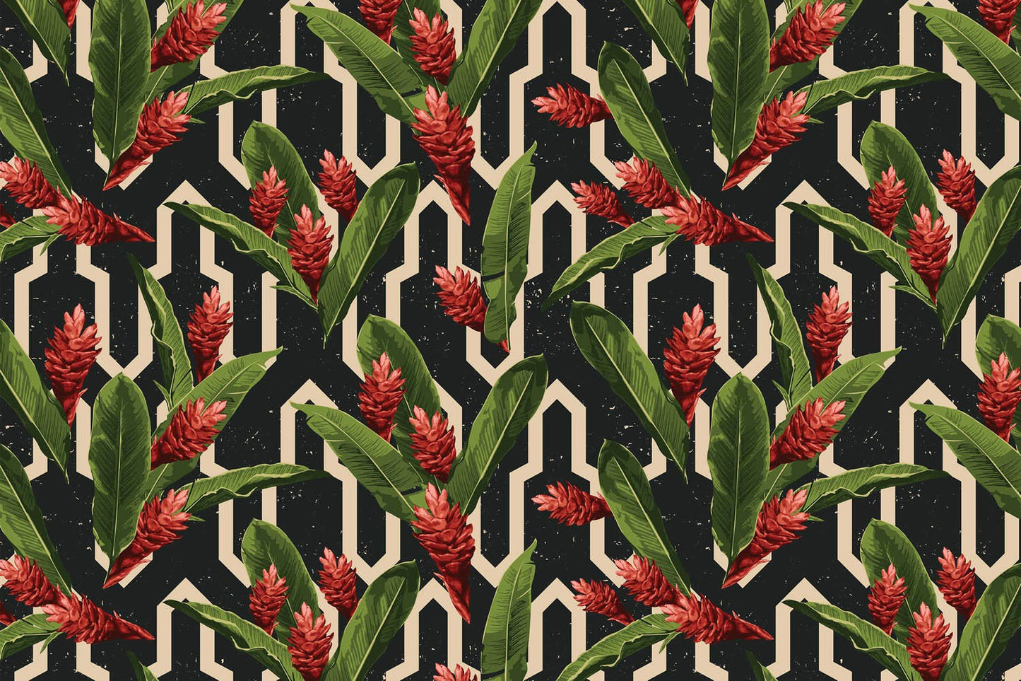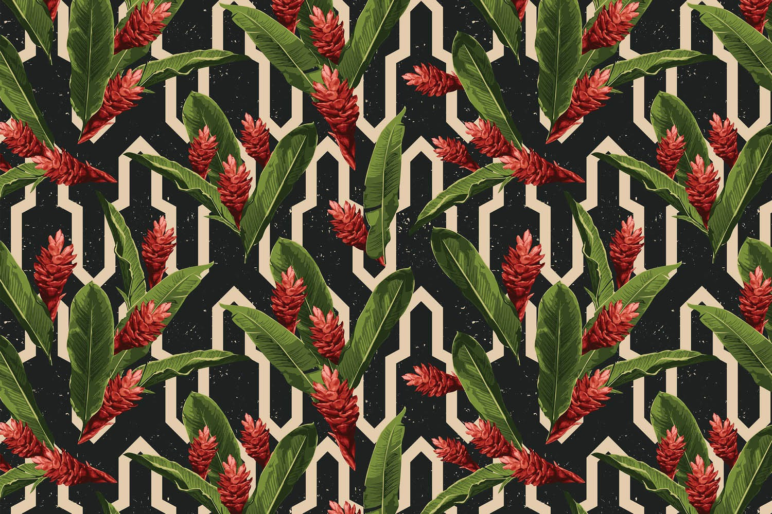 Red Flowers Floral Patterns Green Wallpaper Mural