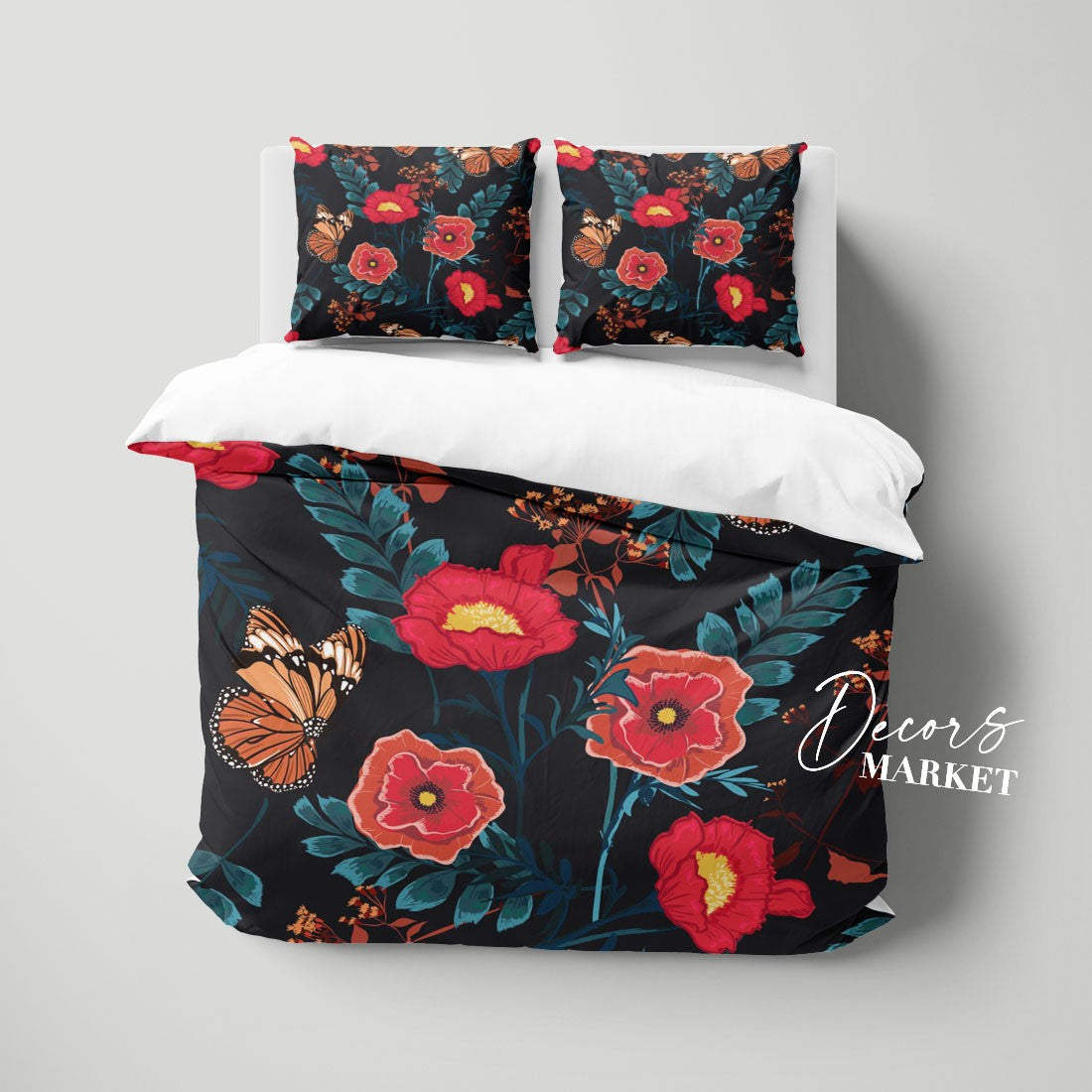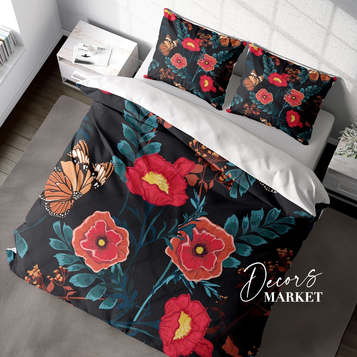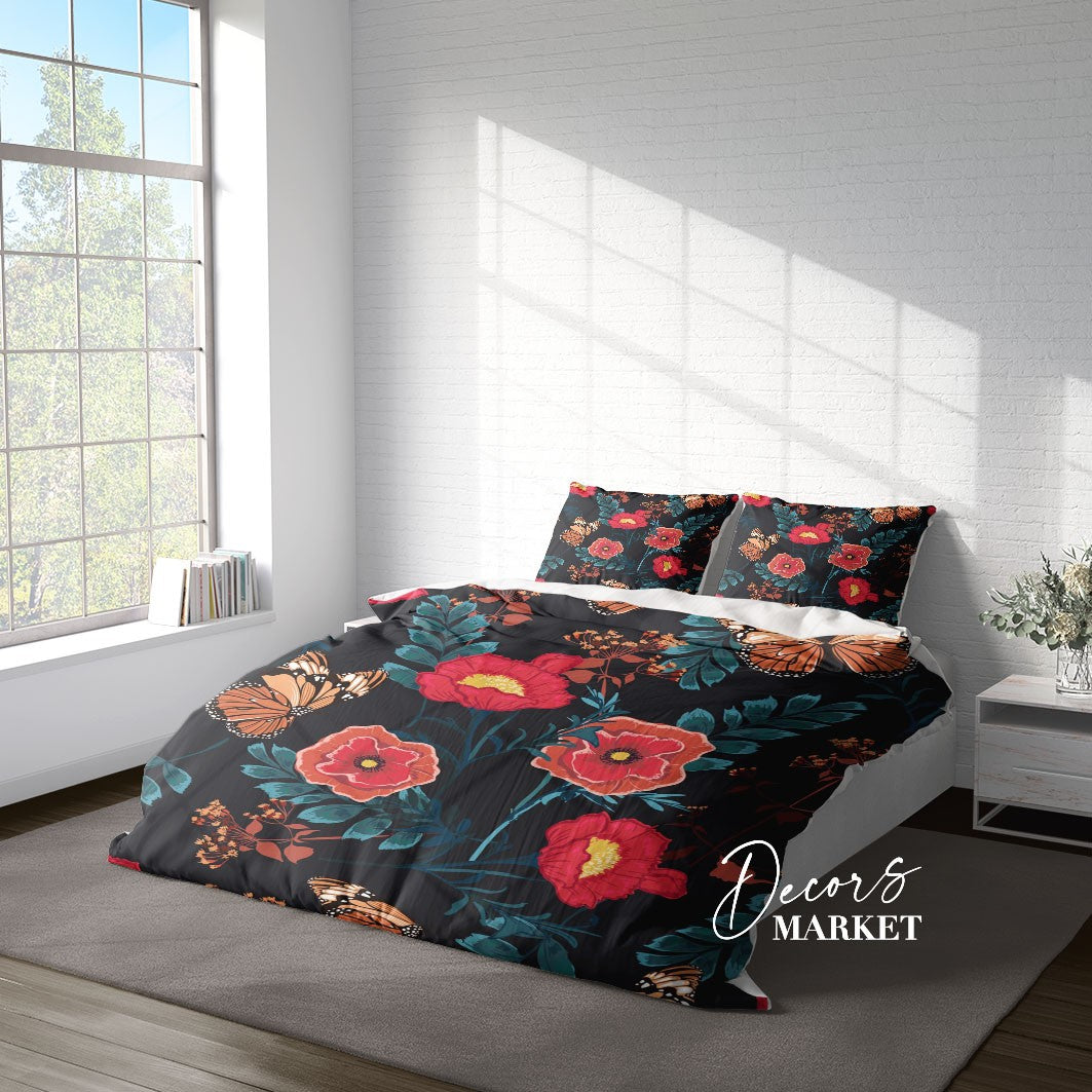 Red Rose Butterfly Duvet Cover Set w Pillowcases, Red Floral Flowers 3D Quilt Cover, 3pc Single Double Queen King Size Doona Cover