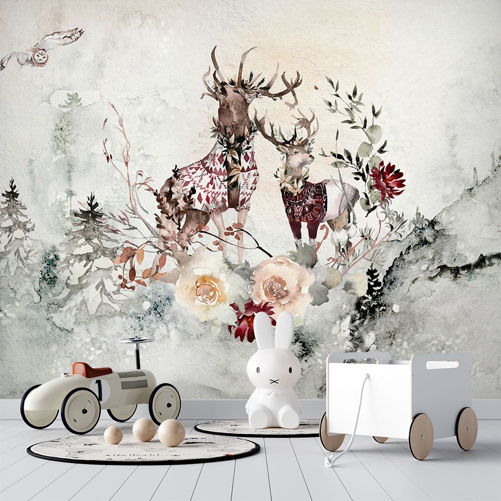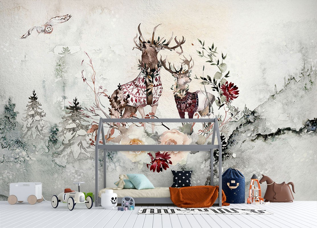 Reindeers Dutch Flowers Kids Fantasy Bright Wallpaper Mural,Self-Adhesive Peel And Stick 3D Wall Paper,Bedroom Removable Wall Decor