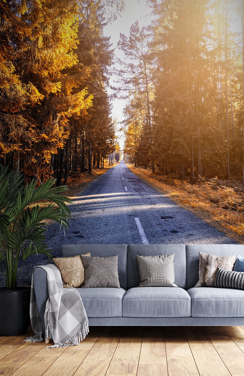 Road Forest Seasons Gold Wallpaper Mural,Self-Adhesive Peel And Stick 3D Wall Mural,Australian Company Removable Wall Decor