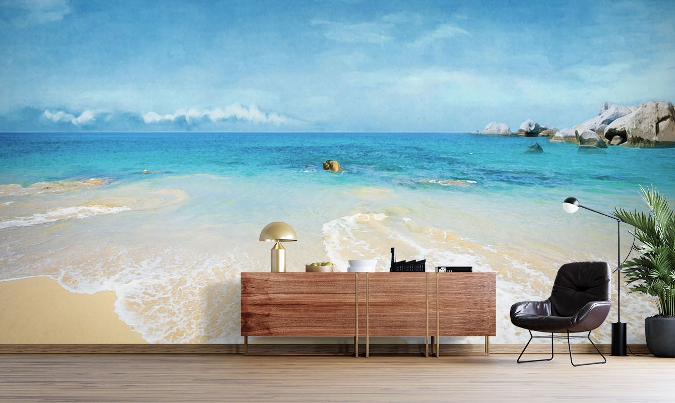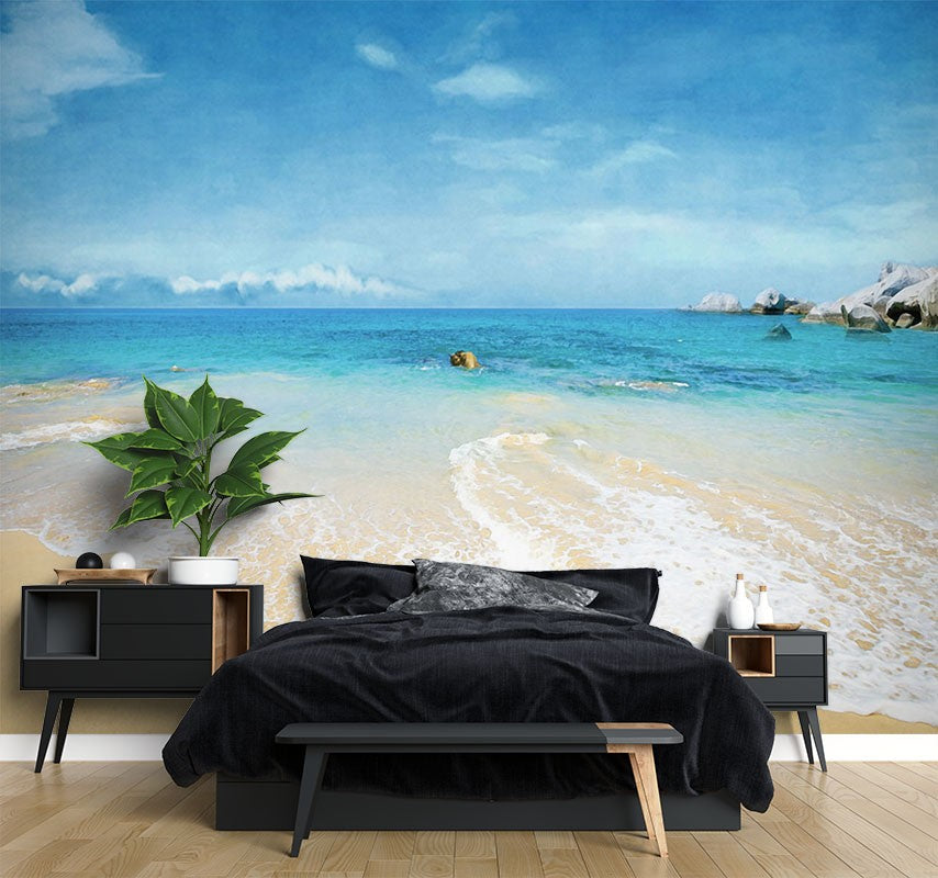 Rocks Beach Blue Wallpaper Mural,Self-Adhesive Peel And Stick 3D Wall Paper,Designer Bedroom Wall Decor